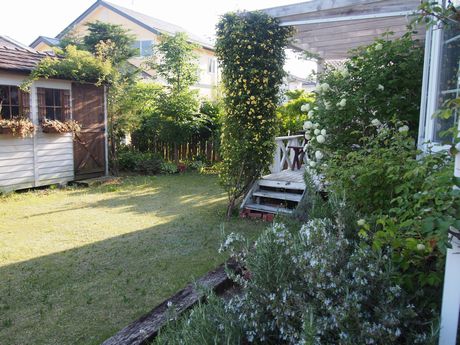 ここは・・・・・・・・・サバくんの豪邸♪3階部分にバラが覆いかぶさって、現在3階に上がれない・・・・・・バフ君(←バラのあだ名)どんどんデッキの方にやってきて・・・・・・たぶん、雨が当たらないし冬暖かいからだと思われる。ちょっと圧迫感があるが、夏は木陰ができてなかなか良い感じ♪サバくんも2階でお昼寝中・・・・・・男の子の家にしては少々エレガントだけど、サバくんは秘密の花園ハウスが、気にいっているようです~・・・・・あ、出てきた・・・・・・
