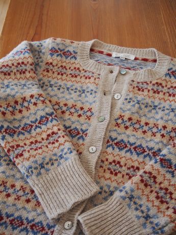 これ♪ エリベのニット。エリベは、スコットランドのニットブランドでです。丁寧に編み込まれた模様が、芸術品のように美しい♪数年前にこのカーディガンに出会ってからずっと大切にしています。でも、冬に数回しか着れないのです・・・・・・・なぜかと言うと・・・・・・・・暑すぎるから・・・・・・・・恐ろしいほどの保温力で普通の冬の気温じゃ、暑くて着ていられないの・・・・・だから氷点下5度以下にならないと出番なし。今日は、寒そうだからさっそく着ました~~~びっしりと編み込まれた裏地。これが暖かさの秘密♪でも厚手じゃないのでとっても着やすい。毛玉もできにくい。今年の冬は、あと何日くらい着られるかしら♪ 今週は気温が高い日が多いらしい・・・・・・・嬉しいような、ちょっぴり残念なような・・・・・