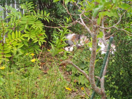 ・・・・むっ・・・・むむむ・・・・!!こんなところで、サバくんお昼寝中だわ・・・・・土の上にわざわざ頭のっけて・・・・もうちょっと涼しいところあるでしょうに・・・・夕方、水やりに庭に出ると・・・・まだ熟睡中のサバくん・・・・・お腹が上下しているので、死んではいない。ホースでジャージャー水やりしていると言うのにまったく起きる気無し。たぶん、水がかかって濡れるまで起きないな・・・・磨きがかかった野良猫の、か細い神経は・・・・・とんと昔に捨てたらしい。