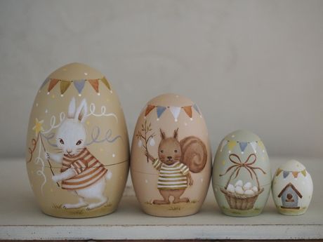 このタマゴマトリョーシカは、タマゴ型なのでイースター作品にしました♪パステルカラーの可愛いタマゴに、ウサギとリスを描きましたよ♪ポイントはぐるりと描いた、フラッグ♪・・・・上から見ると・・・・・・カッパみたい・・・・・・イシシシシ♪裏だってかわいい♪どど~~~んと、かわいいのだっ(←意味がわからん)私のお気に入りは、このリス君!・・・・顔が、なんともかわいい・・・・・この、目がウルウルしたところが♪(←変態です)お申し込みは、もう始まっています。参加したい人は、アンジュさんへご連絡くださいね♪