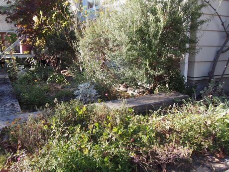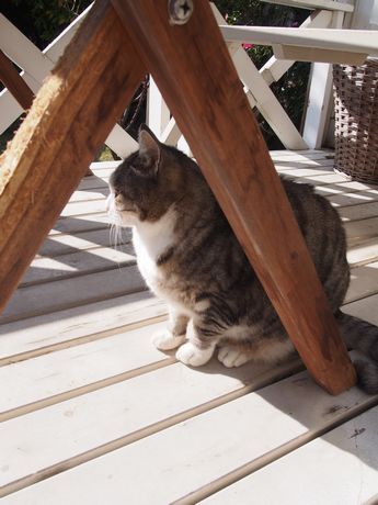 先日から取りかかっている作品を、今日も進めていたのだけど・・・・・・・なんだか上手くいかん・・・・・頭に出た作品と描いている作品が・・・・ちがうっ!!!・・・・何が違うのかわからないのだけど、違うことはわかるう!!色を変えたり、技法を変えたりして何枚か描いたが・・・・ちがうちがうちが~~う!めったにこんな事無いんだけど、数年ぶりに暗礁に乗り上げたわ・・・私・・と!言う事で。さっさとあきらめて、庭へ~~(←コラー)あ!サバくんみっけ♪・・・・・西日をガンガン浴びて、寝ている・・・・・お気に入りのローズマリーの根もとだ♪ でも暑くないのか?上を見ると・・・・・・モモちゃん、発見♪・・・・・サバくんをガン見している・・・・・・モモちゃん・・・顔怖いよ・・・・おもしろい2匹を眺めながら、絵の事はすっかり忘れたあ~~~おいおい・・・・忘れちゃって大丈夫か? オホホホ~~~~