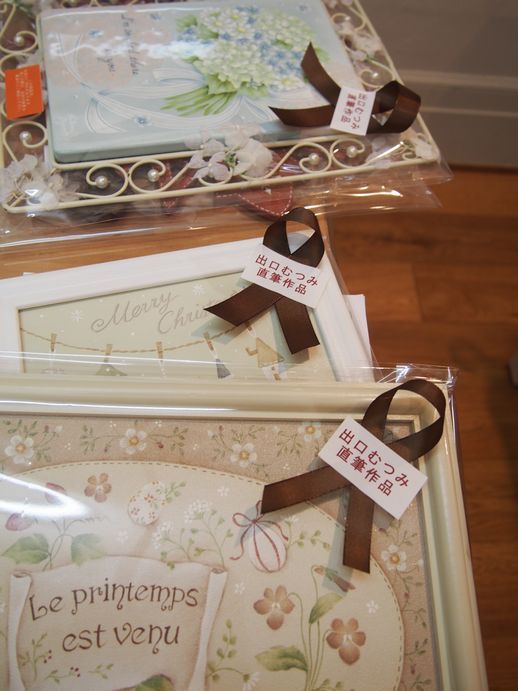 茶色のリボンに、白シール。「出口むつみ直筆作品」と書いてあります。