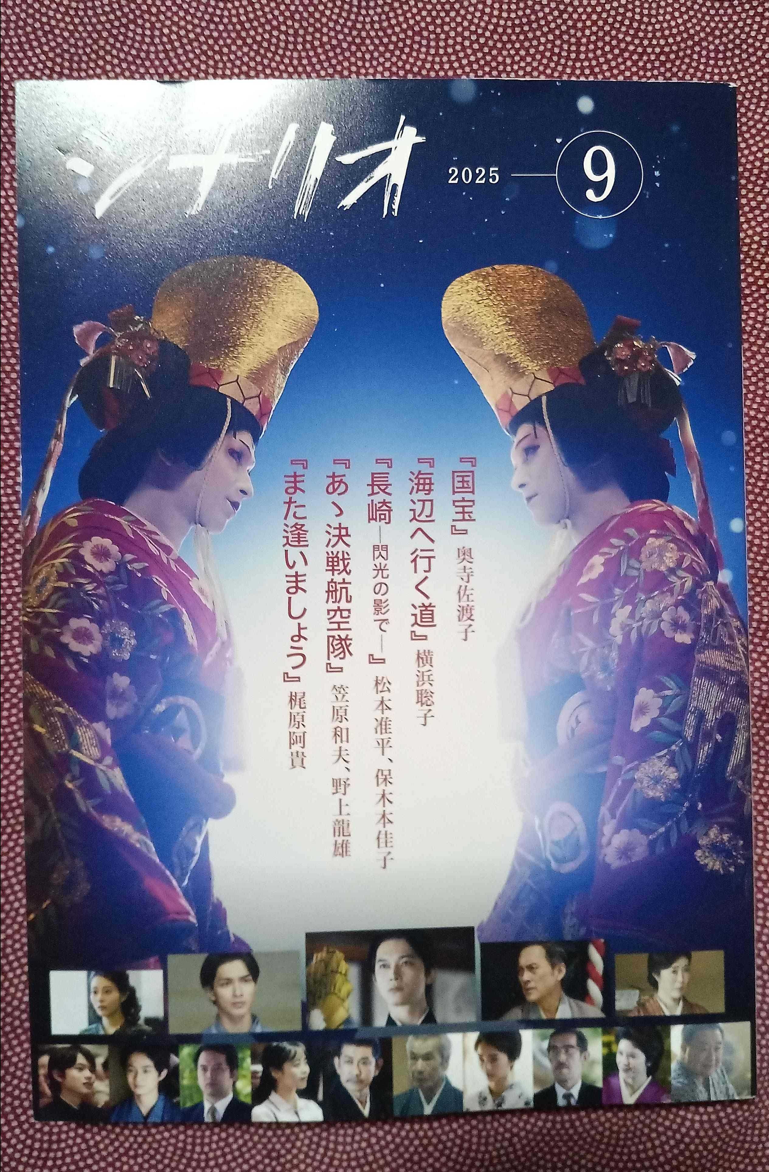 2025年9月24日(水)朝、ブログを書いてブロ友の皆様のところを訪問。するとね、いつもいろいろなことを教えてくださるころりんさんが、映画「国宝」のシナリオが発表されていることを教えてくださったんです。映画雑誌「シナリオ9月号」に、「国宝」のシナリオが掲載されているんですって!!即、amazonでポチ。さあ、慌てたのは私です。実は吉田修一著「国宝 上・下」は購入してあったのですが、大切に読もうと思って読むのを後回しにしていたのです。一番おいしいものを最後にとっておく子供みたいに。実は同じ著者の「パレード」を読み終えたところだったので、いよいよ「国宝」を読むことにしようか、なんて考えていた矢先のことです。これは「シナリオ9月号」が届く前に、原作を読み終えなくっちゃ。ということで、慌てて読み始めました。毎週水曜日は、整形外科通院の日。整形外科で待つ間も読書。バスを待つ間も読書。帰宅してからも読書。「パレード」でもそうでしたが、その時代背景をすごくわかりやすい事例を挙げて描いているのが吉田修一さん。「国宝」では、長崎のヤクザ抗争を描く背景に「前川清とクールファイブ」がキャバレー歌手からメジャーデヴューしたことが書かれています。そう、「長崎は今日も雨だった」っていうあの歌でです。一つ一つの情景の描写が丁寧で、その場面が立ち上がってくるような原作。あまりに速読するのはもったいない。もう少しペースを落として、一言一句を味わって読みましょう。夕刻、amazonから「シナリオ9月号」が届きました。表紙は、映画「国宝」のポスター。もうこの表紙を見ただけで、感動がよみがえってきます。映画は2度観たのですが、3度目も観たかったなあ。背骨の圧迫骨折をしてしまった身には、かなわないことですが。かくなる上は、DVDの発売をまとう。シナリオの次はDVDと、「国宝」の沼にどっぷり浸かってしまった私です。