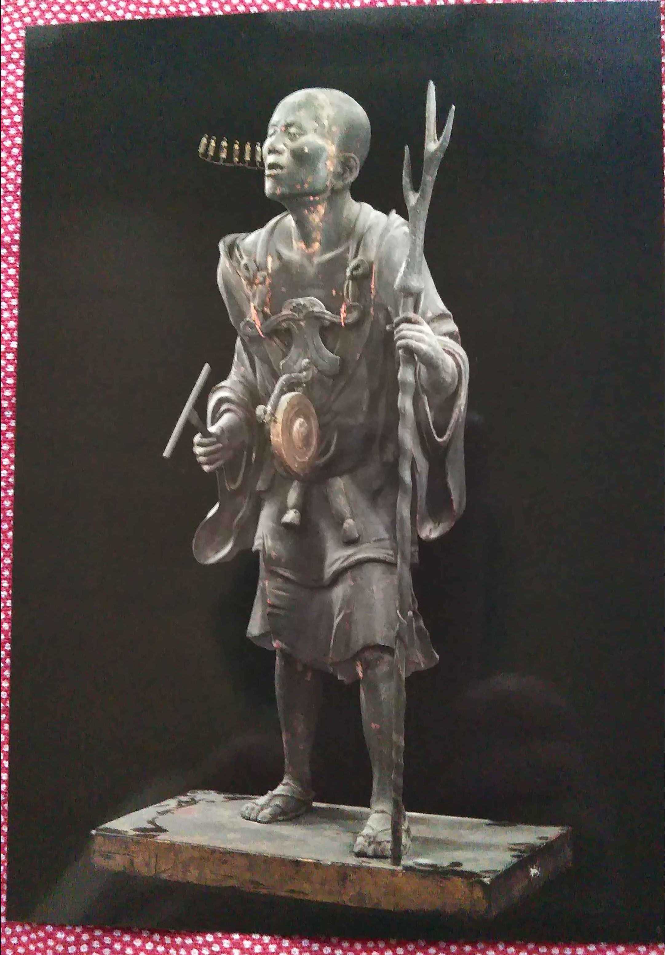 2025年9月13日(土)Eテレの、「謎解き、ヒミツの至宝さん」という番組を録画して観ました。今回の至宝は、「空也上人立像」2022年5月2日、東京国立博物館で開催された「空也上人と六波羅蜜寺」という特別展で「空也上人立像(くうやしょうにんりゅうぞう)」に出会ってから、私はこの仏像にぞっこんになってしまいました。特別展のパンフレットから。それからは京都に行く度に、六波羅蜜寺へこの像に会いに行っています。空也上人は、平安時代中期の僧。その頃の仏教は貴族や武士たち特権階級のもので、一般庶民が信仰できるものではありませんでした。空也上人の生きた時代は、飢饉・戦乱・火事・今でいう流行性の病気などによる、死と隣り合わせのパンデミックの時代だったそうです。一説によれば醍醐天皇のご落胤ともいわれる空也上人は、この像のように手には鹿の角の杖を持ち、擦り切れた草鞋を履き、ボロボロの着物をまとい庶民の間をひたすら歩き、「南無阿弥陀仏」と唱えれば極楽に行けると教えたと言います。「ひとたびも 南無阿弥陀仏といふ人の 蓮(はちす)の上にのぼらぬはなし」と、空也上人は教えました。「どんな罪深い人でも、一度南無阿弥陀仏と唱えれば、極楽浄土にいけるんですよ」という意味でしょうか。現世では食べることもできない苦しい日々の庶民たちに、「南無阿弥陀仏」と唱えることによって極楽への希望をつなげたのです。と言いますのも、当時は地獄絵図がたくさん描かれて、地獄に落ちる恐ろしさは今では考えられないほどの恐怖でした。行脚の途中では、水のないところでは井戸を掘り、荒れた道を直し、川に橋を掛けたりと、庶民のために働かれました。この像は、空也上人が死して250年も経ってから作られた物。最近作者の名前が像の中に書かれているのが、発見されたそうです。それが驚いたことに、「運慶」の子「康勝」の名だったというのです。京都東寺には、康勝作「弘法大師座像」という有名な像がありますが、その康勝が六波羅蜜寺のために彫った作品が「空也上人立像」だったのです。運慶もその頃の仏師としては珍しく筋肉などを写実的に彫る人でしたが、息子の康勝作のこの空也上人立像は実に生きている人そのもの。手には血管が浮き、諸国行脚をしたたくましい足にはひらめ筋がくっきり彫られていて、前かがみの姿勢は今にも動き出すのではないかと思わせるほどリアルです。最大の特徴は、口から飛び出した六体の仏像。これは「南無阿弥陀仏」の六文字を表しているのだそうです。この番組の案内がパフュームの3人というのがちょっと違和感なんですが、それでもお久しぶりに空也上人立像に会うことができて、幸せな時間でした。ああ、また六波羅蜜寺に行きたい!!!空也上人に、お会いしたい!!!