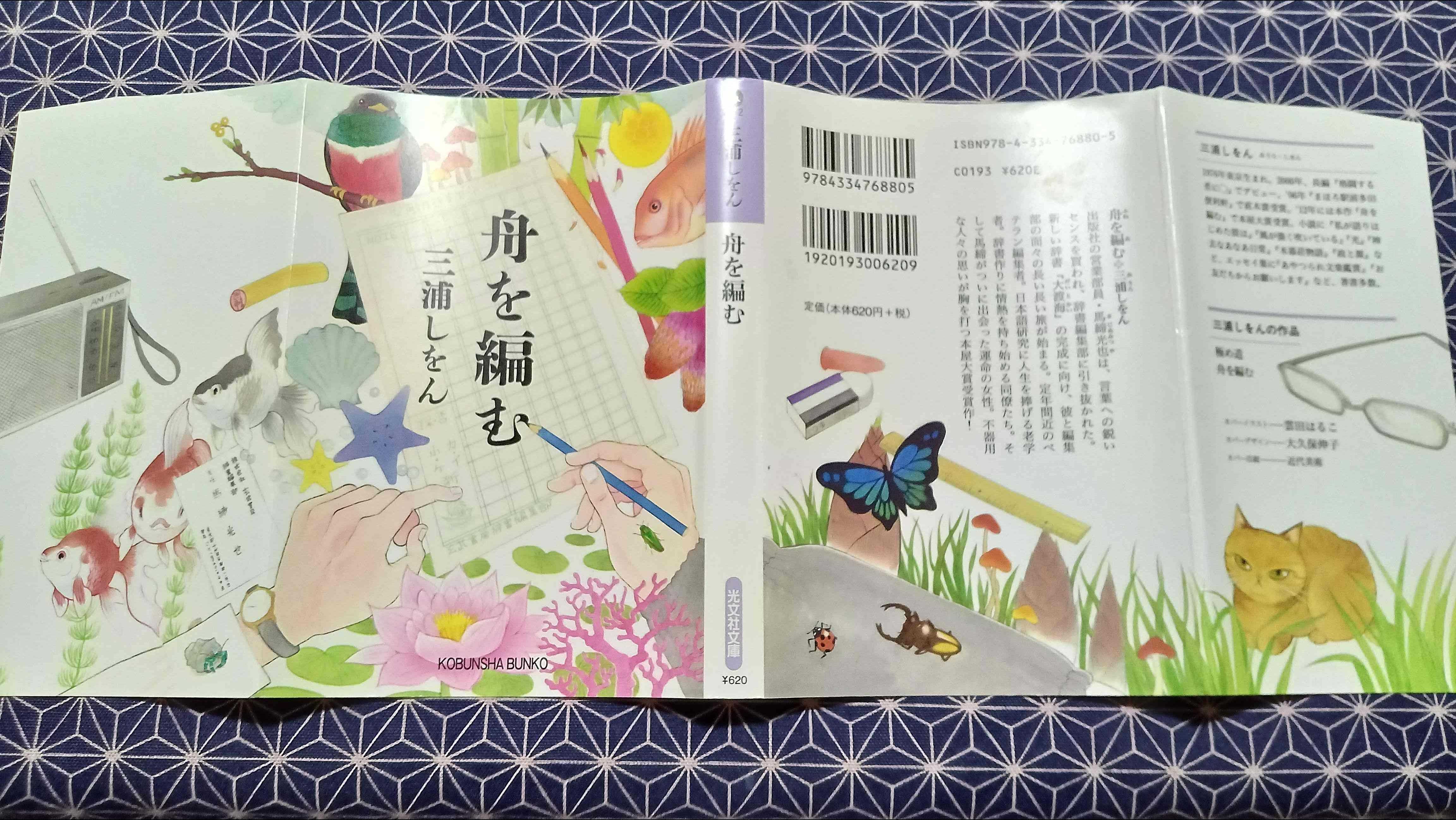 2025年9月4日(木)台風15号が発生して、天候が不安定になってきました。昨日などは、「線状降水帯発生の恐れ」という恐ろしい警告がLINEで市から届きました。幸い我が家付近は免れたのですが、多摩地区でもあたりが真っ白になるほどの土砂降りの地点もあったようです。午前中は曇り空・午後からポチポチ雨が降り始め、夜には本格的に。明日は台風の影響でもっとひどくなるようです。九州・四国地方は、台風の接近で危険な状態になるとのこと。どうぞお気を付けいただきますように。9月初めから読み始めた、三浦しをん著「舟を編む」ほぼ読み終えました。「本編」は読了。「解説」も読みました。では何が残っているかと言うと、このお話の中心人物である「玄武書房」の辞書編集部主任「馬締 光也(まじめ みつや)」が、「林 香具矢(はやし かぐや)」さんにあてて書いた15ページにもおよぶ「恋文」を、まだ読めないでいるからです。なぜ読めないか?あまりにこの本が面白くって、一気に読むのがもったいなくって・・・。お楽しみに残してあるんです。本編のことは、いずれ書けるときに書くこととして、今日は本のカバーがあまりに可愛らしいので紹介します。折り返しの部分まで、全部開いて見ました。表側のカバーにあたるのは、写真左側部分。辞書作成にかかわる方々が、街角の会話・テレビで流れる言葉などなどから、日々新しい言葉を採集してメモするための用紙「用例採集カード」が、中心にあります。カードの下部には「玄武書房辞書編集部」って、書かれています。それを取り囲むように描かれているのは、鳥・魚・植物・キノコ・貝などなど。物や事象にかかわるあらゆるもの、ということでしょう。折り返し部分には、ラジオと「馬締 光也」の名刺。ラジオを聴きながら「用例採集」をしている図、のようです。裏表紙にあたるのが、写真右側部分。消しゴム・指サックや物差しという机上に置かれているものと、虫や筍。折り返しには茶虎の猫。これは小説の中に出てくる、半分野良猫の「とらちゃん」実に自由で、そして馬締と香具矢を結びつける重要な役割を持つ猫ちゃんです。カバーイラストは、「雲田 はるこ」さん。カバーデザインは、「大久保 伸子」さん。イラストとデザインの違いがどのようなものか私にはわかりませんが、このお二人がよくよくこの本を読みこまれて作られたのだと思いました。まさにこの本の内容に、ぴたりとフィットするものです。いつもブックカバーにも着目するのですが、ここまで心を奪われたのは初めて。小説本体をよく表していると、感動いたしました。さて、いつ読もうかな「恋文」