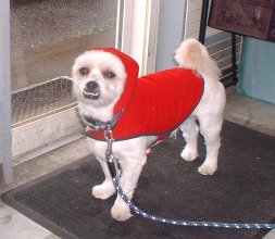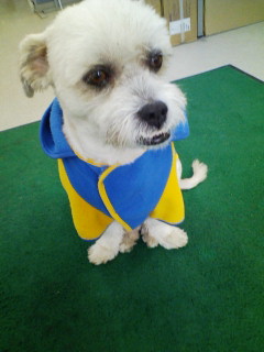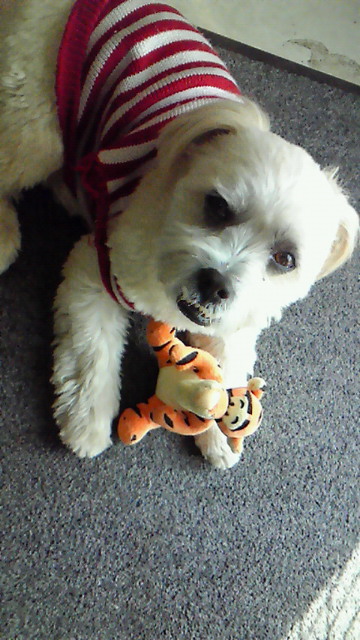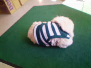 今日は朝から雨つづき・・・でも、頑張ってお散歩行ってきました。濡れたせいか・・・「ちょっと~急に寒いじゃないの。」と言うので (ほんまかいな?)仕方がないので服を着せてみました。「どうよ?」がははは・・・いいんじゃない!なかなか様になってるよ。あら?もうお疲れ?「あんまり笑うから・・・もう寝る・・・」