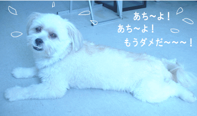 今日も暑い! 天気は 散歩はさぞかしキツかろう・・・ でも、行くぞ~レッツご~! 帰ってきました。 このざまです・・・ 入ってくるなりベタッ・・・ このままの状態がつづく・・・ 冷房の部屋で、しばらく動けないレオ君でした。。。 この後は・・・というと あまりの暑さに、かわいそうなので 少しでも涼しくしてあげようと 只今、ペット美容室にてトリミング中! お迎えは1時。 大嫌いなシャンプーに耐え、身のよだつようなブラッシングにこらえ 涙ちょちょぎれて泣いているであろうレオ君 頑張れ~!そしたらきっと涼しくなるよ~!