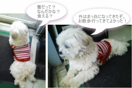 初雪や~!9時半頃から降り始めました。雪の中、慌ててレオくんと散歩行ってきました。なんだか積りそうです。 久々にレオくんの登場です。足元真っ黒くろすけのレオくんでした・・・