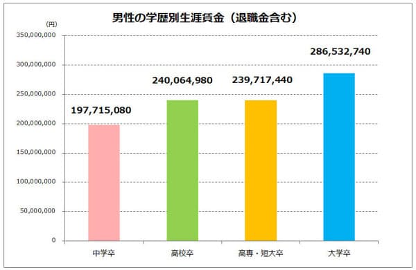 教育費にどのくらいの予算を考えていますか?「正直、1円も使いたくないよ。公立の小中高までの学費は何とか出すけど、大学に行きたいのなら自分で奨学金借りて頑張ってもらうよ」って人もいるでしょうし、中には「金に糸目は付けないよ!最高の幼稚園に入れて最高の小学校に入れて最高の中高一貫校の後、一流大学、しかも医大に行ってほしい、そのためなら、塾にも家庭教師にもいくらでも払うぞ」って人もいるんでしょうね?例えば、幼稚園から私立に入れたら、塾代300万円を足して2500万円位と言われていますが、こんなにかけて元が取れるのか?3人の子供を育てているとしたら、7500万円、そんなお金が普通無いですよね?親族から搔き集めるんでしょうかね?赤字にならないんでしょうか?気になりますね。生涯賃金の差を下の表は2017/5/10日本経済新聞に掲載されていました。https://www.nikkei.com/article/DGXMZO15805150X20C17A4000000高卒と大卒で4600万円の差があるので、マンションが買えると書いてありました。一生賃貸に暮らすのか?自分の家を持つのか?その分岐点になっているというわけではないと思いますが、不思議と丁度良い数字ですね。そして、フリーターの生涯賃金が7000万円かもしれない?親としては心配な数字ですね。それから、医学部の場合は、私立だと6年間で2000~5000万円かかりますが、開業医になると元は取れると言われています。一般家庭で、借金をしてまで応援するのが合理的とは思えないので、6年間で350万の国立に行ってもらったほうがよさそうですね。未来の教育費がいくらかかるのか?早めに計画を立てるといいですね。予算によって、①小中高を公立で頑張ってもらい、指定校推薦で有名大学に入る。②高校だけは私立で、中高一貫に合流して頑張る。③私立の中高一貫で、6年間頑張る。どんな道を選ぶのか?早めに決めておくと、貯金できるかもしれません。
