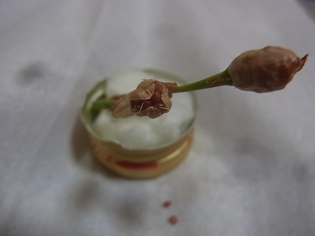 あらかじめ切り取っておいたゲイソリザ・インフレクサの実も莢が割れてタネがこぼれはじめました。