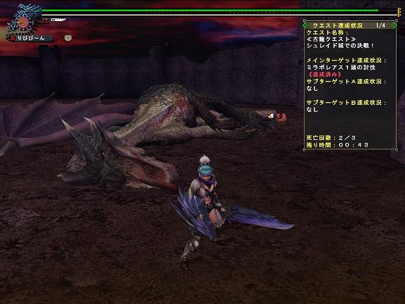 FF、というかPS3すら箱から出すのが面倒くさい自分・・・いかにテンションを元に戻すか模索の中何気にHR800への試練を思い出した「シュレイド城での決戦」ミラボレアス1体の討伐ほほぅ・・・ここは一つ挑戦してみようと思い出発してみました装備は斬れ味装備で持ち込みアイテムは回復・秘薬セットついでに忍耐・怪力の種に強走薬Gときて、気持ち的に薬草w最初はまったくもってヒットアンドアウェイ戦法肝心の回転斬りが空振りしまくります。はいずり攻撃で前に吹っ飛んでしまうと追撃のはいずりを受け簡単に2乙ここで余計びびったのか手数が減る始末残り時間10分コールが起きた時諦めてたんで壁にはいずりしている時にジャンプ斬りからのフルコンボを連発これがうまい具合にヒットし始めたけど、このミラはよく飛ぶ><ちょっとアレですが支給用大タルGを使った^^;残り5分コールフルコンボ連発で斬れ味が蒼になる度に砥石で白をキープヒットストップで効いてる感はあるけど、残り体力はわからん・・・何気に残り時間をみると2分あぁ、終わったな、こりゃ・・・と思って斬ってるとあらん♪倒せたわんwつー事で久々の片手ソロ奮闘記でした・・・ほぼフルタイム・・・疲れたぞ・・・><