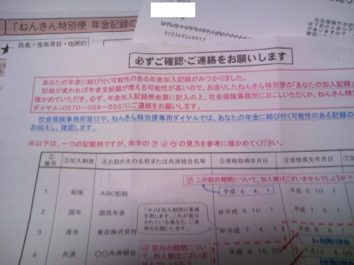 とうとう・・・???我が家にも・・・ 「ねんきん特別便」なるものが到着しました。基礎番号に結びついていない5000万件の記録の中にあなたの記録と結びつく可能性があるためお送りしています。私も・・・若かりし頃、働いていた某企業での半年間と、夫に扶養されていた第3号被保険者の期間がスッポリ抜けてます。夫の3号被保険者であった分は、共済組合なんで、厚生年金や国民年金とは違うところに記録されてるのかなと思ってたんだけど・・・?用紙を見たら、これも記録されてなければならないような感じがします???どうなんでしょう? これ見ただけでは、理解出来にくい5000万件のうち、4割が特定出来てないそうですが・・・他人事じゃない・・・ 恐ろしいことです。3号被保険者であった10年間もの期間が気になって・・・ 急ぎ、記録に抜けてる部分を記入し送付しました。みなさんも、記録漏れないかどうか、チェックを!「宙に浮いた年金記録」4割が特定困難 「名寄せ」完了は6割にとどまる