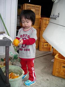 昨日は、バァバとリクとママの3人で熊野へデコポンを買いに行ってきました。毎年、秋にミカンを大量に買っているところと同じところ。デコポンは、隔年でしか収穫ができないようで去年は、買えなかったので今年は、待ちに待ったデコポン!!リクは、ミカンもデコポンも大好きなので大喜び♪ ここのミカンやデコポンはスーパーで売っているのより、全然甘くてホント美味しい。熊野のデコポンを買っているお宅に到着すると早速・・・『ミカンたべたいな~』と言うけどいつもデコポンは包丁でオレンジを剥くみたいにカットして食べるので『無理だよ、おうち帰ってからにしようね~』って言ってたら・・・なんか、おとなしい・・・???って思ったら・・・素手で必死に剥いてるし~(驚)。そこまでして食べたかったのね(笑)。でも、ミカンを作っているおばちゃんによると大人なら素手でも十分剥けて、しかも薄皮も食べられるそうです。う~ん・・・リクは大人並の力!?このバカ力は、きっとママに似たのでしょう(笑)。そして、デコポンとその他にも『きよみ』っていうミカンとその他いろいろ・・・全部で100kgほど買って帰ってきました。そのうちの少々を我が家にも分けてもらいリクはせっせと自分で皮を剥き食べております。昨日は、そのあと尾鷲の海で少し遊び途中のお魚市場でお買い物。ここは、さんまの丸干しが有名で干し具合といい、塩加減といい・・・とても美味しい。去年の秋、みかんを買いに行った時も買ったけど今回も購入。お金の出所はバァバですがね^^;15匹ほど頂きました~しばらくは、さんまの丸干しが食卓に並びます。