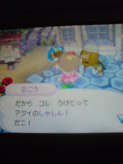 本を読んでいたら目が冴えてしまって眠れない なおちゃです通信してたわけじゃないよ まだ誰とも遊んでません 街森2日目前日遅すぎてどこも開いてなかった街に遊びに行ってみましたしゃぼんだまをもらいましたDS版にはいない住人さんがいっぱいいますね♪全部で何人くらいいるんだろうね~ の劇場に行ってリアクションをもらってきましたリアはDS版と一緒で4つまでみたい5つめを登録しようと思ったらダメでした ↑ここまではお昼に30分ほど遊んだ時のこと その後なおちゃの順番が来たのは午後10時ちょい前でした今日もローンが払えずまだ一番小さいお部屋のままですしかたがないのでフリマ用に魚を釣っておきました 教えて欲しい事がありますに頼まれたことなのですが旦那のキャラに伝言をして欲しいと言われましたこの場合どうやって伝言するのでしょうか?話しかける度に同じ事を言われちゃうのこの連休中には通信できたらいいな