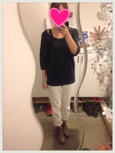 おはようございま~すまたまたビジューチラ見せコーデですビジューのインナーはGUのタンクトップです昨日の記事のも色違いですさすがにタンクトップとニットじゃ寒いのでヒートテックも着てますが、ヒートテックまで見えて納まりが悪いので胸元にビジューの付いたTシャツを買ってみましたまだ手持ちのニットと合わせてないのですが、上手い具合に重ね着できる事を期待していますまた着画にて結果報告しますね~さあ今日は、73さんとバーゲンに行ってきます素敵な出会いがあるとイイな~今日も遊びに来て下さりありがとうございます更新の励みになってますのでよかったらポチっとお願いしまっすにほんブログ村