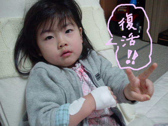 こんちは今日はいっぱい書きます。実は萌ゾー、金曜の朝「大変」でした。rikibooの「起きろ~!!」の声に目を覚ました萌ゾーはなぜかベットにいきなり正座。かと思うといきなり静かに吐き出したのでした。普通だったら泣くはずなのに不気味なほど静かに。そして何故か左斜め下を向いたまま・・・よっぽど気持ち悪いのかと横にしたところ目は左上を睨んだまま瞬きもしない(゜-゜;)「ママのこと見てごらん」と声をかけても応答なし。次の瞬間小さな痙攣がはじまったかと思うと一瞬呼吸まで止まりやがり(やばい!)と心の中で言ったrikibooはすぐアゴを上げ気道確保し吐いた物を詰まらせないよう顔を横向きに。(こういう時って不思議とものすごく冷静で痙攣時は呼吸が止まることもあることとか思い出すのね)そしてすぐ119!5分くらいで救急車到着。その間に萌ゾーの痙攣は大きくなってゆきガックンガックンやってました(顔色真っ青)でも救急隊員の方に嘔吐が始まってからの説明を分単位でできたのも無意識に時間を見てたんだな~と自分にちょっと関心。「母強し」っつうのは守るものがあっての言葉で実際それを身をもって経験した母rikiboo(`_´ゞ)でも救急車に乗って酸素マスクつけられ目の玉をライトで照らされてるところなんて見たら急に怖くなって旦那に電話。搬送先の病院にすぐ駆けつけてくれました。でー結局、血液検査と点滴とCTで異常なし!(この頃には意識も戻り「おのれ、殺す気か~っっ」とばかりに病院の最上階まで響くほどの大発狂。注射され痙攣止めの座薬まで入れられ大パニックに)でも定期的な嘔吐と頭痛で苦しそうでした。様子が落ち着き追加の座薬を処方してもらい帰宅。その夜には腹が減って仕方ない無敵な萌ゾーがいました。お粥茶漬けをバクバク食べ土日は普段と変わらない様子。で、昨日「検査の必要ナシ!」と診断された萌ゾーは超元気もりもりです!!なんだか、もっと小さければ熱性痙攣っていうのにあてはまるんだけど、萌ゾーは4才になっていたし痙攣の時間も20分と長かったのでちと心配だったのですがなんか大丈夫そう( ̄▽ ̄) ね?大変だったでしょ? その日の夜点滴と採血のあとが痛々しい・・・救急車に乗ってる時の記憶がないのが悔やまれるらしい・・・私は初救急車しっかり覚えてるけどね~