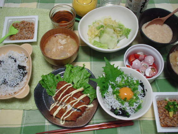 今日は私のおなかが空いちゃったという理由で旦那の帰りを待たずにお夕飯 昨晩、焼肉丼にしたところ、渋い顔して「明日はしらすのトロロがけ」にしてくれとリクエストがありました。(萌ゾーは基本、肉より魚らしい・・)そんなわけで~ しらすのトロロがけ丼大根とネギと油揚げの味噌汁白菜の浅漬けプチトマトのシーザードレッシング納豆なんとなく買ってしまったアジフライ(惣菜)ビール麦茶 そんな感じで、酒のつまみは・・・ この表情ですかねぇ~ おっっ うまいねっっ rikiboo様に座布団一枚ですな っつうか、早く一緒に酒飲みてぇ~な~