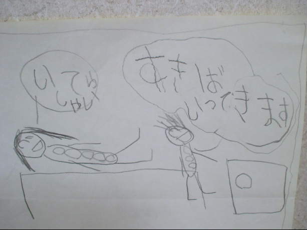 今朝ボサボサ頭に半分死にかけで起きてくるととっくに起きて朝食を食べ終えた萌ゾーに笑顔で一枚の紙を渡されました。(今日は旦那がお休みなので萌ゾー朝食やってもらいました。rikibooの朝は半分腐敗が進み死臭が漂っているような状態。ヒドイもんです。)それはさておき、また何かお手紙的なものかと寝ぼけまなこで見てみると・・・ ( ̄Д ̄;) そこには我が家のいつもの 「朝」が描かれておりました。 そう、イヤっていうほど分かりやすく・・ 見て分かるように(分かり過ぎるように -_-;)朝、仕事に行く旦那を妻がベットで寝ながら見送る夫婦の絵・・・読みづらいが旦那:「秋葉行ってきます」(秋葉原=旦那の職場)妻 :「いってらっしゃい」旦那の進む方向にはしっかり玄関のドアが(-д-;) いや、そうなんだけどさ、あってるんだけどさ、なぜこのタイミング?!なぜこのタイミングでこの絵を?!なぜ今?! 実は娘的にこの絵には隠されたメッセージがあってそれを母rikibooに伝える為?!ってこと?4才が?そんな手の込んだこと?死臭を漂わせながら軽いショックに悶々としていると 「わかる?これ、ママ。これ、ベット。で、これがパパ。」 (-”-) 「わぁ~っとるわ!!!」 とりあえず隠されたメッセージはなかった模様。 で、言い訳:うちの旦那様は少々腸が弱く、朝食を食べて電車に乗るとお腹が痛くなってしまうので仕事の時は朝食は一切食べません。なので妻は用なしというわけ。用もないのに半分腐敗が進んで死臭が漂っているような妻にうろちょろされても迷惑でしょ?で、この絵のようになるわけ。でも、この絵、間違ってるんだよね~ベットで横になっている妻の目は実際は開いていません。口もきけないほど深い深い眠りの底にいます。 (-o-)yoo0