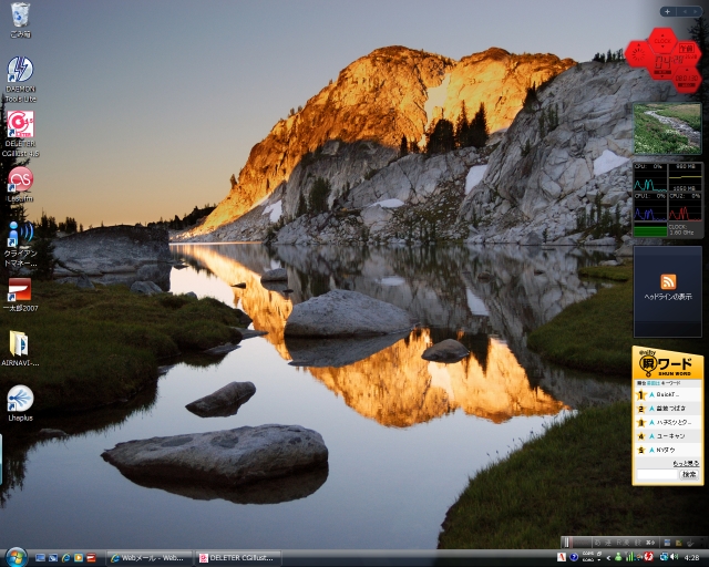ただいまの時刻4時25分。遅すぎだろ!っていうか、さっきまで寝てました・・・そんなことより今日は、Vistaを自分好みにアレンジしたよ!まずXPと同様に壁紙の変更からこれが元々の壁紙Vistaの標準壁紙では一番好きだった。変更後。Vistaはらき☆すたにしてみた。やっぱオタクだなー・・・この次に、Office2003と一太郎の導入。たまにつかうときがあるからね・・・そしてなんといっても、IMEからATOK2007に変更したこと!ATOKはやっぱり使いやすい!他にもガジェットとかいろいろ変更したんだけどね。今日はこの辺で終わりにしときますわ。一応受験生だし・・・明日(31日)は私立入試だよーorz誰か応援メッセージとかくれないかな・・・