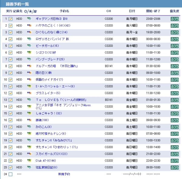 今日からまた学校が始まりました。今日は雨が降ったので通学とかが大変でしたが授業中は全然眠くならないのが不思議なくらいです。そのかわり、この時間になって一気に眠気がwwwそういうわけでテスト前で部活もなく早く帰れたわけですが、テスト勉強は少ししかやっておらず、レコーダーにたまった1週間分のアニメを視聴してました。といっても1週間でこれだけ録画予約がありますから(^_^;全部視聴できてませんwwwそしてほとんどがAT-X(CS333)ですよ。HDD300GBだとすぐに容量オーバーです・・・そのため、1日1回はダビングするようにしてます。そういうわけでアニメを視聴しただけでほとんどテスト勉強ができずに眠くなってきましたw今日はもう寝て明日徹夜しよう(ぇ