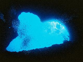 FUNダイブは、講習じゃなくて遊びで潜るダイビングです。SHOPのボートで潜るポイントまで連れて行ってもらいます。ボートに乗って知ったこと。わっきぃ、船に弱い。私はすっかりはしゃいでいて、船首に座り他のゲストの人達とワイワイ。わっきぃはそこへ全く来ない。やっと気づいて船尾へ行くと。船酔いするから前には行けないだって。。しょうがないので放置することにしました。(薄情ですね、やっぱり私)初めてのFUNダイブなのでポイント言われてもわからない私。ブリーフィング(ダイビングとかポイントの説明)されてもさっぱりわからない・・・。周りの反応からいいポイントらしい、Blue Hole。リクエストも多いとあとで知りました。☆中から見るとこんな感じ☆Blue Holeに入るグループと上から見るグループに分けました。私はわっきぃのおかげで中に入るグループに入りました。初心者の私がホントは行けるはずないんです。わっきぃ、感謝、感謝。。ココは70メートルくらいの大きな縦穴。途中35~40メートルくらいのところに横穴があってそこから外へ出る。そんなブリーフィングでした。(英語なので多分・・・)耳抜きしながらただただ潜って行った私。Blue Holeの魅力は穴の中から上を見上げる。すると穴の出口がブルーのハートの形に見えるということ。ちなみに・・・。カップルで見るとこの先もずっと一緒にいられるとか・・・。後半は定かじゃないけれど(笑)。このときの私はそんなこと何にも知りません。。しかも風邪で耳抜きが辛いわっきぃを放置して先に潜って行ってしまった薄情な私。さっさと潜ってさっさと横穴から脱出しちゃいました。一緒にどころか1人でもちゃんと見てないし。。だからダメになったのかな。。このことは後々どこへ行ってもいい笑い話にされるようになりました。旅行に行く時はもっと下調べしないとね。いい勉強になりました。。