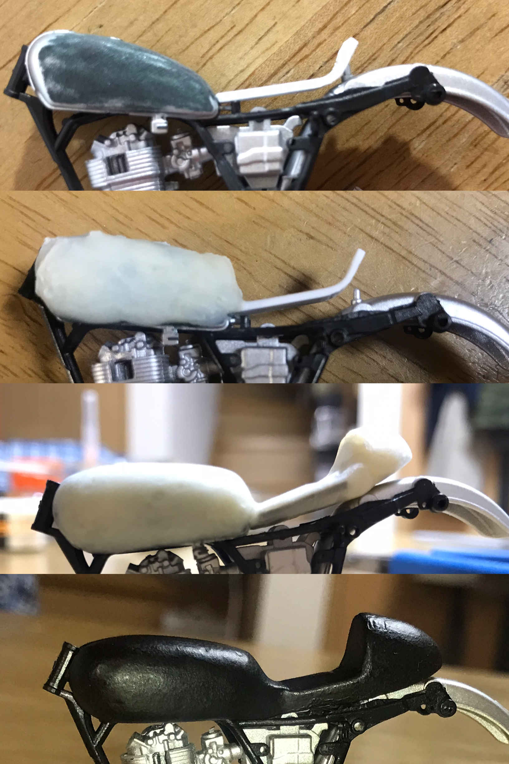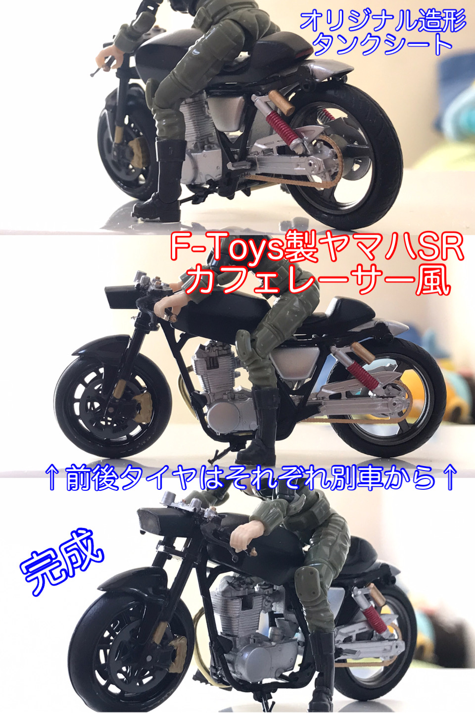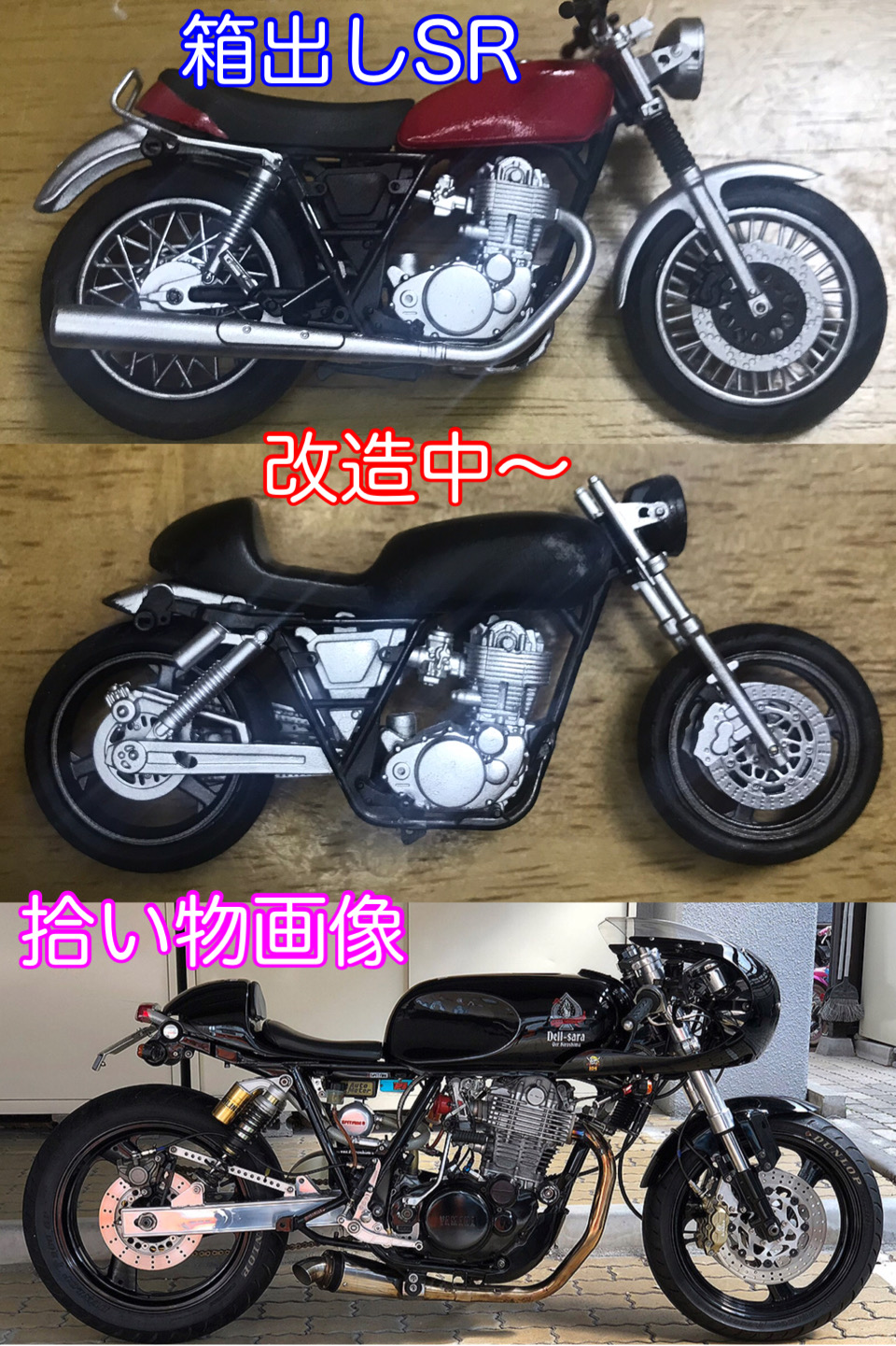 カスタムSRの続きでっすタンクからシート、テールに至るラインが今一つのデキでもコレはコレで取っておきたい……100均へ向かってお湯まるくんを買ってきましたで、複製してから違うテイストのタンクを造形〜で、拾い物画像のSRはフロントがUSDフォーク……ぁぁどうしようで、ここで出番が来たのが300円で何台も買ったディアゴスティーニこの中のアプリリアのフロントを徴用で、マフラーは真鍮線と真鍮パイプでテキトーにリヤ周りは500円ガチャのゼファーカイをぶった切ったで、こうなりました塗装仕上げがまだだけど新造形のタンクも仕上げが終わってない…こんな感じになりました!キャスターが立ち過ぎなのは御愛嬌って事で〜