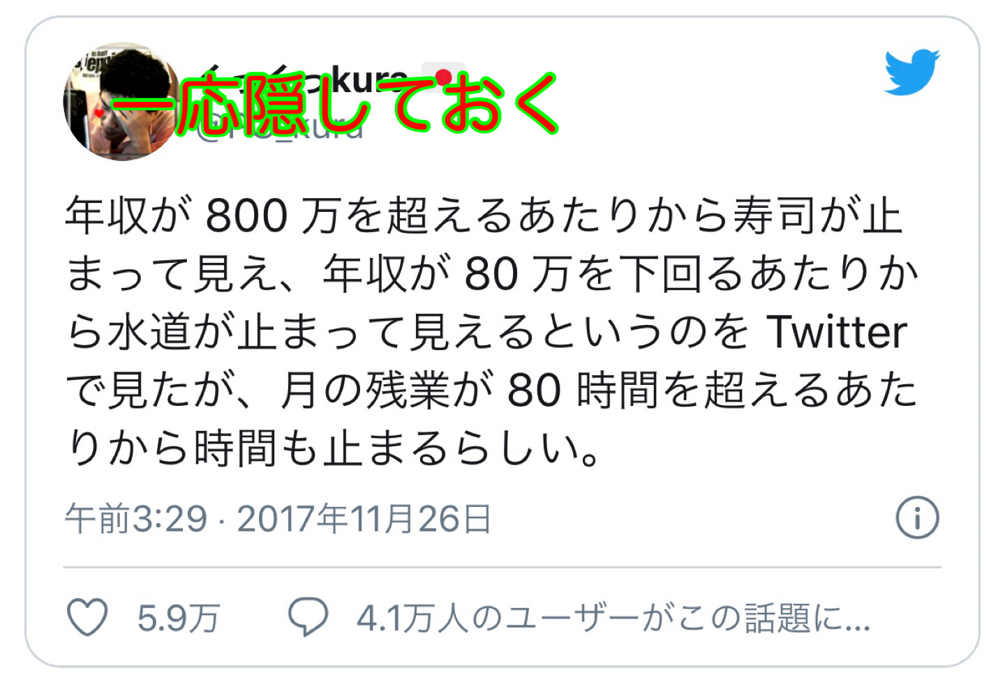ちょっと古いネタだけど今日拾いました〜残業時間に関してですが、80時間となると土日キッチリ休んで、毎日4時間で達成ですから時間が止まるレベルには程遠いですね楽ではありませんが、止まる感覚にはまだまだ〜20年前くらいに経験済みです自身での経験は流石に無いですけど聞くところによると200時間を超えると、それに近づくらしいですわ昔の出版系とかはそのレベルに近かったのでは?寿司が止まるの……見てみたいですわ