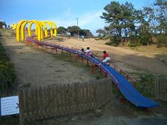 土曜日の日記です。今日は、朝からとてもいい天気でした!そして、とても暖かかったので海を見に行こう~ということになりドライブに着いたらもうお昼を過ぎてたので、腹ごしらえですここは海のそばなのでもちろん「海の幸」をいただきましたちなみに食べたものは前回と一緒です8/27の日記ですもぉ~、ホントおいしくておいしくてたまらん!!前回は私とパパのを取り分けて食べてたりんりんですが、今回はミニいくら・かに丼を注文。いくらは全部たいらげましたミニ・・・といっても結構な量がありました・・・その後は、近くにある「三崎公園」へ。ここは岬全体が公園になってるとても大きな公園です。高さ60mのマリンタワーなんかもありました。高所恐怖症のイヤがるダンナをひきずりながら、展望台に登りました。展望台の上にはスカイデッキがあって、見晴らしがすごいよかった~!!デッキには2組ノカップルがラブラブなかんじでくっついてました~。ん~、あんな時もあったわね、とすでにオバサン化したこの私を待ってたのは・・・展望台のなるべく内側でりんりんを抱っこしながら、腰が抜けそうになってるダンナが約1名・・・なんかどっちもどっちだわ・・・下りた後は「煙とナントカは高いところが好きって言うけどねぇ・・・」とつぶやいてましたその後は公園の中にある遊具で遊んだり、 ↓出発点(黄色い所。恐竜の頭みたいです。そして骨の中を通る感じです)ロングローラー滑り台これ以外にも、各箇所に遊具があって子供連れファミリーが沢山!!海のほうには小さい浜なんかもありましたそして、に入って帰ろうかと思いましたが、日帰りの温泉施設がなんだか激混みで、時間も遅かったので今回はやめました。帰りは高速で帰り、途中のS.Aでこんなもの見つけました。かりんとう饅頭前に、ローカルテレビで紹介されてたのを覚えてたので、買ってみました。外側の皮にかりんとうが入っていて、「カリッ!サクッ!!」 みたいな食感でした。公園のUPDOWNのきついところをりんりんを追い掛け回してたので、本日めでたく筋肉痛