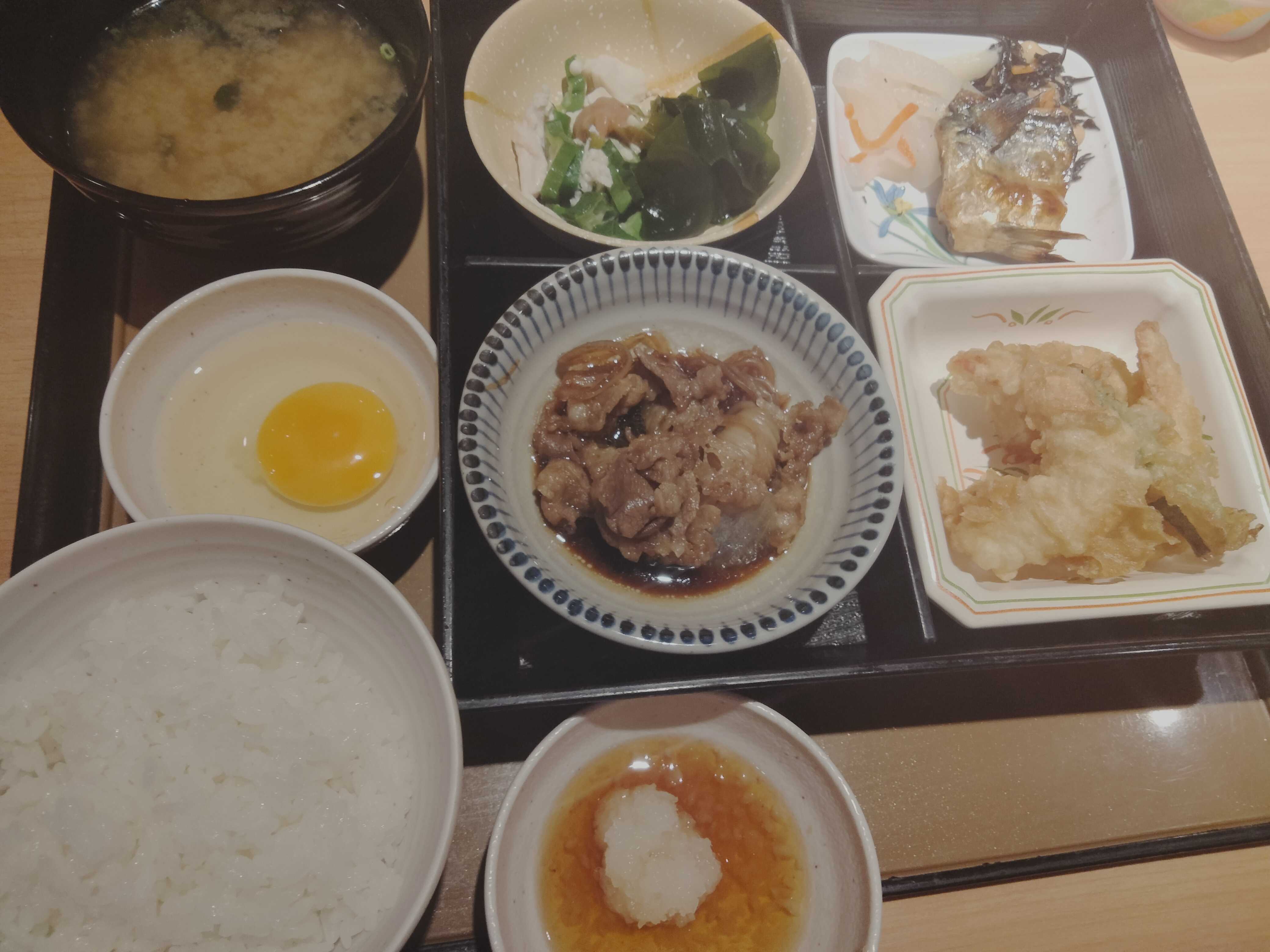 やよい御膳 天ぷらやミニすき焼きバラエティ豊かでおいしかった(^^)アプリクーポンで生卵🥚30円プラスした!