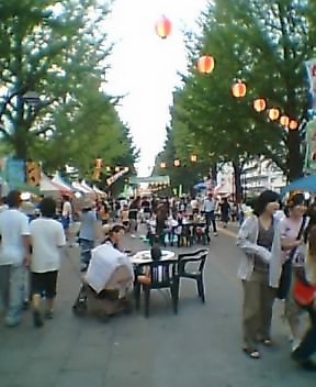 今日はお休み。クーラーのない部屋で、窓を開け扇風機をつけながらアイロン掛け。あぁ、いい汗かいたー。ま、暑いときはちゃんと汗をかくことが自立神経のためにいいそうです。 ←負け惜しみ?んが、午後から都心を通過してお花のお稽古にでかけたが、外は猛烈に暑い~暑い、というより熱い。渋谷で乗りかえるときが最悪。人は多いし、もう、イライラする。六本木のほうがマシ。会社に行っていたほうが楽だと思う、近頃の夏。それに輪をかけて暑さを呼ぶ行事が明日から始まる。地元駅から我が家の下を通って公園までの園路。屋台がずらぁ~っと準備が完了していた。あぁ、明日は団地のお祭り&盆踊り大会だぁ~~~家に帰るのも一苦労する3日間。特に盆踊りの騒音には発狂しそう。イライラするくらいなら、と思って1度踊りに行ったことがあるが、子供たちをビデオ撮る親たちであふれかえっていて、すごーく白けた。おまけに土曜日は花火大会もある。花火の音が団地中に木霊するのは驚きの現象。家の騒音は何デシベル?まぁ、子供が楽しみにしているお祭りに文句をつける気もないけど、ゴミだけはしっかり片付けてちょうだいね。それにしても、近隣住民に生ビール券の1枚でも配ってくれればいいのに~さ、私たちはどっかに避難しようっと。