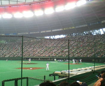 いっぱい汗をかいて、いっぱい水分を吸収した1日でした!朝、8時前に起床。もう、カンカン照りで庭の水やりをしているだけで日射病になりそう・・・。梅雨が明けたとたん、庭の木々たちはモサモサ大きくなり(喜)、害虫たちもはびこり(怒)。7リットルくらいの水が入れられるカエルのジョウロで何往復も。筋トレになります(笑)そして庭の井戸水はとっても冷たくて気持ちイイ~♪早起きして走りに行けばいいのでしょうが、まぁ、私には無理。1回くらいできても習慣にすることはできないでしょう。自分にできる範囲、生活の範囲内で走りたいと思っているし。ということで、午前中ジムに行きました。土曜日のこの時間帯、ジムに通う習慣はつけられそう。そしてそれを頭と体で覚えたら、季節が良くなった頃、その時間帯を走りの時間に移行するのは難しくなさそう。ヒザの筋力アップと有酸素運動を兼ねて、「はじめてのステップ」に参加。気持ちよく汗をかけました。次のステップのクラスも出たかったけど、今日はおでかけの予定があり、トレーニングルームでXトレを踏み踏み。TVで「王様のブランチ」と「あたしんち」を見ながら。(こんなのでトレーニングになるのかしらね?)シャワーを浴びて帰宅。今日は夫が車で送り迎えをしてくれたので助かった。外に出た瞬間クラクラする暑さ・・・。給水たっぷり。ちょっと家で休んでからおでかけ。武蔵野線と西武線を乗り継ぎ(秋津の乗り換えは遠い・・・)、インボイス球場へ♪今日は西武vs日ハム戦!年に1回、西武戦を見に行っているが、今年は引退宣言をしている新庄選手を目当てに日ハムにしました。が!!今日は新庄選手はスタメンどころか終始出番なし。がっかり~~~っ!スタジアムは今までの中で一番人が入っていましたね。ビール付チケットのため、毎回3塁側に座る私たち。いつもは3塁側でもライオンズ声援が多いけど、今日は日ハムファンに囲まれしまいました。ま、負けないぞー!!1回裏、ライオンズ攻撃はトップバッター、初球からヒット☆というファンには嬉しいスタートを切りました。1回だけで3点ゲット♪わからないでしょうが、打者カブレラです♪このビール付ペアチケットは本当にいい席なんですよ♪ ・・・3塁側だけど。このリードで調子を良くしたのがピッチャー・2年目の涌井選手(20歳)。9回にホームランで1点を取られるまで完封ペースでした。その涌井投手を見事にリードしたのがキャッチャー・炭谷銀仁朗選手。ギンジロウは、なんとルーキー19歳!つい半年前まで高校生だったんでしょ?! すごーい♪フレッシュバッテリーで本日、西武ライオンズは6対1で快勝でーす。カブレラ選手目当てに球場に足を運んで3回目。3戦全勝でーす♪ ←去年は西口投手の完全試合目前までいった試合だったし♪勝利の女神でーす。 おほほ~☆それにしても、日ハム・小笠原選手。さすがです。ダラダラとしたプレーを見せない。守備でのファインプレーやボテボテゴロの打球で観客が「あーぁ」と溜息ついている中、全力疾走で1塁セーフ!敵ながら天晴れ! プロの野球人。 男前でしたっ!!8回裏、日ハム・稲葉選手がファールボールを補球しようとしたところ、1塁側フェンスに激突!しばらく起きあがられず、タンカに担がれて退場。その際、日ハム側よりも先に、ライオンズ側の外野席から「がんばれ稲葉」コール!素敵なスポーツマンシップでした。近くに座っていた超日ハムファンの1年生くらいの少年が周囲を湧かせ、みんなでその子に拍手したり。もう、本当に可愛くて面白くて、みんな大爆笑でした☆汗だくになりながら見た試合ですが、やっぱり生で見るスポーツは楽しいですね♪実はTVだと10分も野球を見ていられない私なのでした・・・。