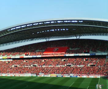 「We made it Together!!」サッカー観戦日和の午後。東浦和駅からサッカー場までの直通バスに乗り、行ってまいりました埼玉スタジアム!!夫にはやっぱりチャレンジ富士5湖の赤いTシャツ着せて!(爆)外の紅葉よりも赤いスタジアム。こんなにいっぱいの赤を初めて見ました。選手入場時には、各席に用意された色分けされたフラッグ(私の席は赤)でスタジアム全体に模様が浮きあがりました。ものっすごいきれいでした!!あんまりにもすごいので、写真を撮りはぐれちゃいました(笑)観客数:62,241人(Jリーグ最多観客数)ガンバ大阪のサポーターはここだけ。指定席には、ほんのチラホラ確認できる程度。6万人はレッズサポーターでしょう、今日は。驚いたのは、意外にも年齢層が高いことです。若い、元気なサポーターはゴール裏の自由席で跳ねまくっているからでしょうが、指定席は30代後半から上の年代がほとんどでした。おじーちゃん、おばーちゃんがレッズのマフラーとか巻いたり、シャツ着たりしていて、可愛いの!試合は最初から最後まで、ガンバ大阪に支配されていました。パスがするする通るガンバ、プレッシャーが弱いレッズ。見ていてハラハラする展開。 勝ったのが不思議なくらい。先制点はガンバ。私がトイレにいって、目を離したすきに・・・。 ←寒くてトイレが近かった・・・勝利の女神(私)がいないとすぐこれだっ!!すぐに絶妙なコースを飛んだボールがガンバのネットを揺らし、同点に追いつきました。そして前半終了間際、追加の1点。これで調子に乗ったレッズ、後半開始後にもう1点追加っ!とここまでは良かったが、レッズ、気が抜けたのか?!ガンバ大阪に1点追加され、点差1点。このあとのガンバは粘りに粘りました。猛攻につぐ猛攻。ラスト5分は、レッズゴール前での攻防の繰り返し。優勝はできなくても、レッズには勝たせない! という気迫を感じましたね。敵はいい試合を見せてくれました。もう見ていられなくなるような攻撃を受ける中、やっと試合終了のホイッスル。試合は辛勝、というイメージ。でも。この瞬間、浦和レッドダイヤモンズが優勝を決めました!!スタジアムに轟く6万人の大歓声!鳥肌がたつような瞬間でした。表彰式。優勝カップが陽に輝いていました。スタジアムをWinner's runをする選手たち。ホーム側のネット裏、熱いサポーター席は、異常な盛りあがりでした。すごいですねーアウェー側に近い位置から見ていると、一つのイベントを遠くから見学しているような、映画のエンディングを見ているような・・・。同じ場所にいるとは思えないほど、温度が違いますね。閉所恐怖症の私にはいられない場所です(笑)かつては連敗につぐ連敗、お荷物球団と呼ばれたレッズ。J2降格の屈辱をも味わいました。親会社のリコール隠し問題もありました。どん底から這いあがって、そして今日、初めてのJリーグ優勝を決めました。それもサポータの熱い応援があったからでしょう。地域に愛され、育ってきたチームだからでしょう。私も結婚後は本籍地が浦和市にあったので、ひっそりと応援してきました。さいたま市民になった今、これからも地元チームを応援していきましょう!!2位は川崎フロンターレ。新婚時代、等々力スタジアムの灯りが見えるアパートに住んでいました。このころはJ1昇格を目指し、奮闘していたチーム。ベルディが川崎を捨てたあと、川崎唯一のチームとして、地域に愛されてきたんでしょうね。ここもJ2落ちから這いあがって、優勝争いするチームになったのはうれしいなぁ~東京ベルディがJ2でもがいているのは、親会社の金儲けを優先し、ファンを裏切った罰でしょう。(ファンのみなさん、ごめんなさい。 私も昔は大ファンでしたけどね。)我が家からの交通の便の良さも確認できたし、来シーズンはもっと足を運ぼう!浦和レッズにさらなる飛躍を期待して☆あ、そうそう。うちのちゅーTANはレッズのマフラーを買って、うれしそうに首に巻いておりました(笑)来シーズンはチームシャツを買いそうな勢いです!