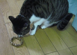 昨日はね、ブログの更新したかったんだけど、時間がなくなっちゃって・・・諦めた なんでって・・・自分のブログにコメントの返事するときも、ブログ友達にコメントするときも書き込みしても、しても、「アクセスが混雑してて・・・」の案内が出てねできなかったのぉ家の用事しながら、時間をあけて何度もお邪魔させていただいたりしたけど結局、いつも訪問してる友達のところから帰ってきたらもう、日付が変わる頃だったで、諦めました明日も仕事だからね。。まじめでしょ でね、 昨日 書くつもりだったのはこれ くんくんくん。。。何これ? これ何なの? うりぁ うりぁ うりぁ~ (動きが早くてぶれちった) やめてょお~リン~~~せっかく貰ったのにぃ~ 数珠みたい?数珠に見えるけど これはね、白檀の球が繋いであるの 白檀・・・お香とかによく使われてるよねお線香にも『白檀の香り』なんてあるしこれは、お香用の傷物(?)を細いゴム紐で繋いであるの傷物といっても匂いはあるからね手首につけてたら ほんのり香ってくるくらいだからかな? リンが クンクンして鼻で押していって最後にパンチの連続技見ててかなり面白かったょお でもね、せっかく 下さったのに・・なんてことを 反省しなよ・・・febはい ごめんなさい
