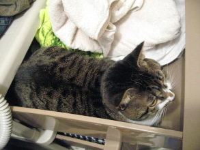 夕方のこと・・・洗濯物をたたんでそれぞれの場所に持って行ってる時のこと 開けっ放しにしていたバスタオルを入れるケースに見慣れた模様が・・・ あれ? なにしてんのょぉ~ こんなところで・・・ なに 何か用 何か用?って お邪魔だよぉ りんちゃん え~~でなきゃダメって感じで キョロキョロしてる そうそう、そこにはバスタオルが入るんだからね洗ったバスタオルがりんの毛だらけになってるかもしれないなぁ とにかく早く出てね・・・と言い置いて しばらくしてから戻ってみたらなんで? 自分じゃ出られないやん どうなってんの? 実は、ライトにイタズラされて出られなくなってるりんでした
