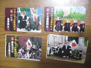 今日は お昼ごろから降りの京都・・地域によっては せっかく咲いた桜が散ってるかもしれないね さて、今日はなめ猫 私が初めてなめ猫を知ったのは 小学校の高学年だったと思う「なめんじゃねぇ」の台詞で暴走族風の学生服やセーラー服を着たニャンコの写真やカードが流行ってたと・・・思う こんなんだったよね(^^)今、また流行ってきてるの?去年あたりからちょくちょく見かけてたんだけど、レフトが駄菓子やさんに行くたびに買ってきてたなめ猫カード見せてもらってビックリしちゃった今は 社員証や学生証・免許書まであるのねそれから・・・これねにゃんこのお札 ちゃんと透かしもあるぅ~ということは・・・そうです こんなカードもありました なめ猫銀行のキャッシュカードおっと、忘れちゃいけない・・・小切手これは、なめんなよ銀行なんだねなめ猫エクスプレスカードやテレフォンカードだっていろいろあるんだね~レフトに説明してもらいながらケラケラ 笑ってしまいましたぁ