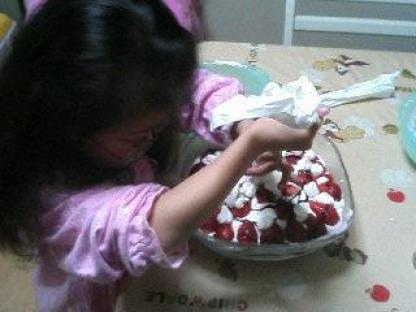 先日会社の慰労会があった旦那。その後2次会に居酒屋に行ったらしいが「すっごいでっかいパフェがあってさぁ高さが40cmくらいでしかもそれ2個もたべちゃったぁ」ものすごく大喜びなのはいいが、あたしも食べたいよあ~、食べたい。大きいパフェ食べたい。生クリームでオエッってなりたいちょうどその時、おすそ分けに大粒イチゴを2パックいただきましたしかも前日にシリアルを買っていたこれは!作らなきゃてなわけで、生クリームを買ってきて、パフェもどきを作る事にとにかく巨大なのを作ろうと長女もお手伝いバナナ味のシリアルの上に生クリームとイチゴとチョコシロップその上からチョコ味のシリアル乗せて、また生クリームとイチゴとチョコシロップ聞いてるだけで、胸焼けがするでしょ?そして完成巨大パフェもどき夕飯を軽く済ませて、家族4人で食べ始めましたが・・・・・1/3程度で全員沈没ぎぼぢわりゅい(気持ち悪い)・・・・・・・しばらく甘いものは見たくないが、あと2/3残ってるのどぉーしよー