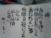 何でこんなに過ぎるのが早いんだろう(TT)仕事だとなが~く感じるのにね~(><)今日は、昨日みたいに眠りすぎたら夜眠れなくなるので、ほどほどの時間に起きましたww最近読んでいた相田みつをさんの本から。。。とっても共感した。携帯で撮ったから、ちょっと画像悪いんだけどね。仕事だけでなく、何でも楽しいこととかの時って、時間はあっと言う間なんだよね~大好きな人とのことを書いたこの詩もホント、そうだよなぁって思ってさぁ。何でも楽しく過ごしていきたいけどそうはいかない。だからって、それをムダな時間にはしたくないから一日一日を大切にしようって改めて思った。明日からまた、頑張るぞ~☆