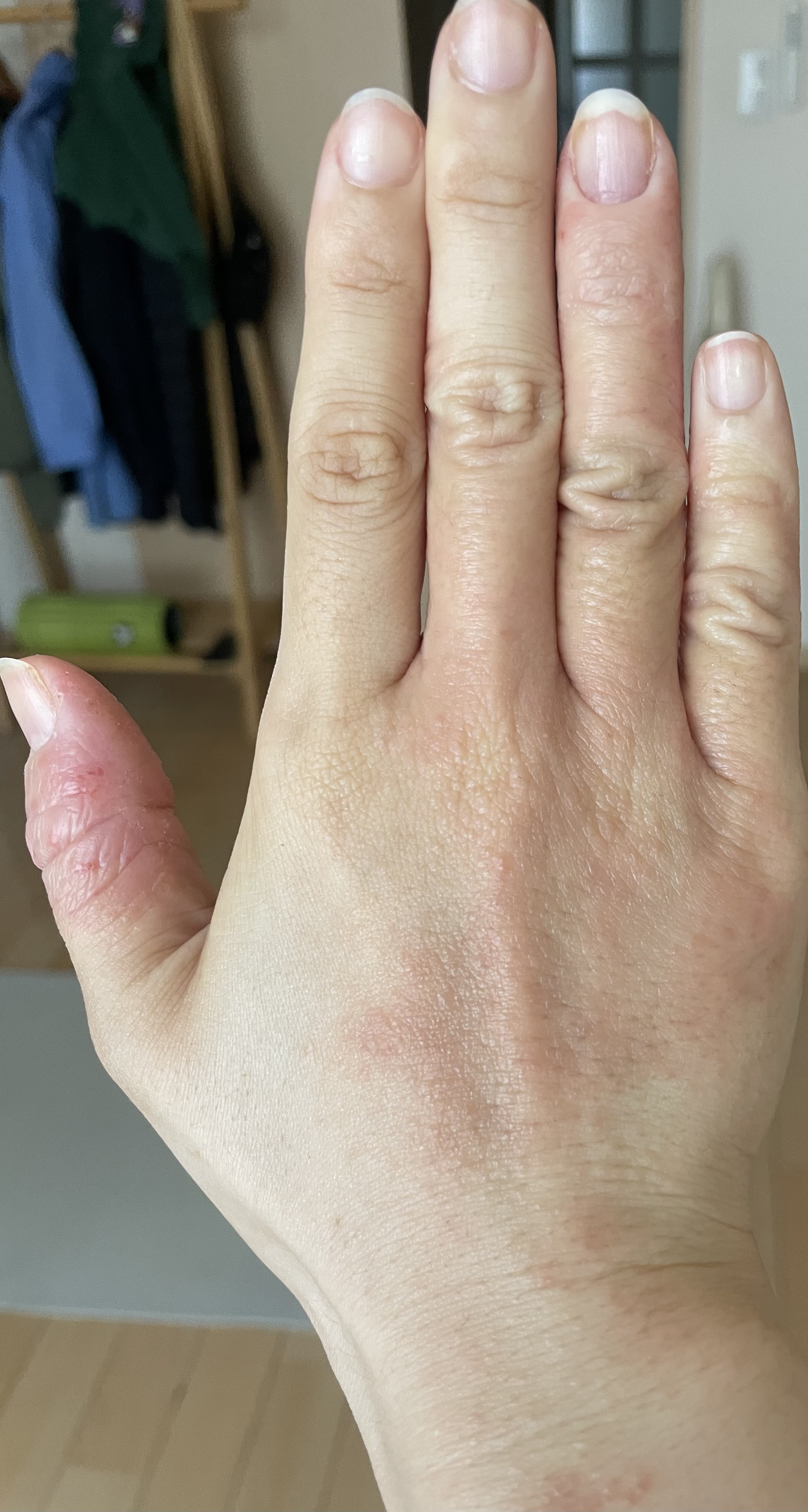 こんにちは!世の中はGWですが、私はカレンダー通りお仕事です!でも週末から4日間お休みだから楽しみ〜、小旅行に行くのでまた記録として残そうかな。先日のアトピー大爆発の続きですが、あの日から体に栄養をたくさん摂ろうと奮闘中です!なるべく体に良いもの、添加物の少ないもの、手作りを意識して食事してます。あと栄養補助食品も使用して栄養を体にいれまくっています笑結局消化器官が元気じゃないとこの栄養も全ては使われないんだなぁと思うと自分の消化器官に自信はないので不安になります、、笑お菓子などの甘いものは控えるようにして、そうしたらあまり欲がなくなってきました。栄養が潤ってきたのもあるかもですが、また爆発するのが怖いというトラウマみたいなものもあるかもしれません。とりあえず元に戻るまではこの生活を続けて、体に栄養を満たしていけたらなと思っています、、問題のその手、今どうなっているかというと、、大分綺麗になってない?!ちょっと感動、、まだ爆発してから5日も経ってないけどこんなに良くなるんだという感じ。相当自分に栄養が足りてなかったのかと痛感。そしてストレスとの向き合い方も考えなきゃいけないと改めて思いました。綺麗になるまであとちょっと、、と信じて日々頑張ります!連休までにはもう少し良くなっていると願って!🙏🏻同じような悩みを抱えていたり、他のアレルギーを抱えている方、あまり自分を追い詰めず周りに助けを求めてくださいね。きっと嫌な気持ちになって、モチベーションが上がらなかったり、辛くて色々やめたいと思うんじゃないかなと思います。でも周りにSOSを出すことで少し楽になるし、生きやすくなります。私は周りにそういうことに詳しい方だったり、経験をしていた方がいたのでとても心強かったです。職場の方も優しい方が多かったのでありがたかった。何よりパートナーが味方になってくれて私は強く生きようと思たし、精神的に支えられました。改めて自分は周りに支えられていると感じたし、私ももっと優しくあろうと思いました。今回のアトピー大爆発をきっかけに、心と体を今一度見なおすきっかけになったと思います。アトピーよ、私のもとに現れてくれてありがとう。そのきっかけをくれてありがとう!笑ということでまた、手がどうなったかは記録としてアップしていきたいと思います。では本日はここまでです。読んでいただいた方々、ありがとうございました🙂↕️