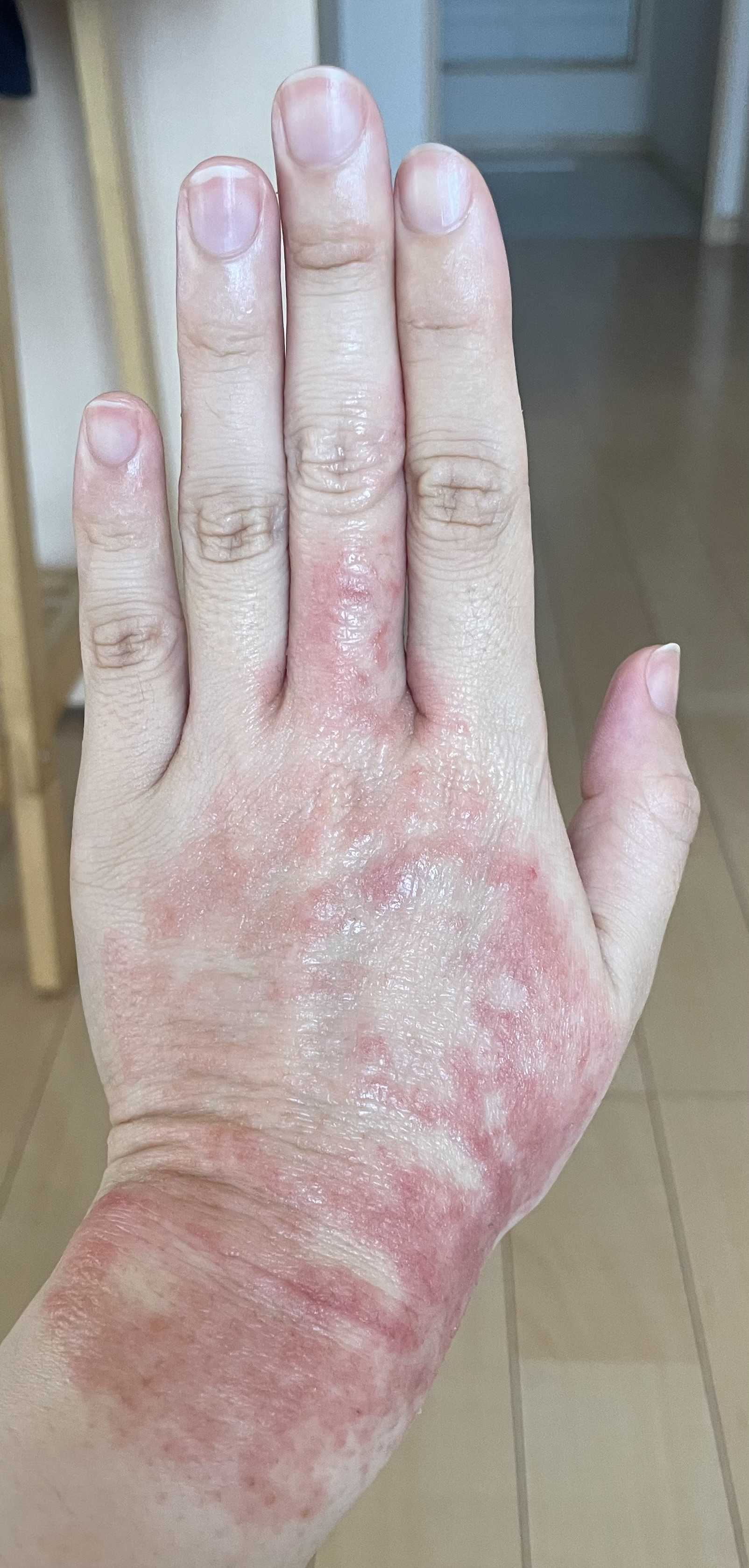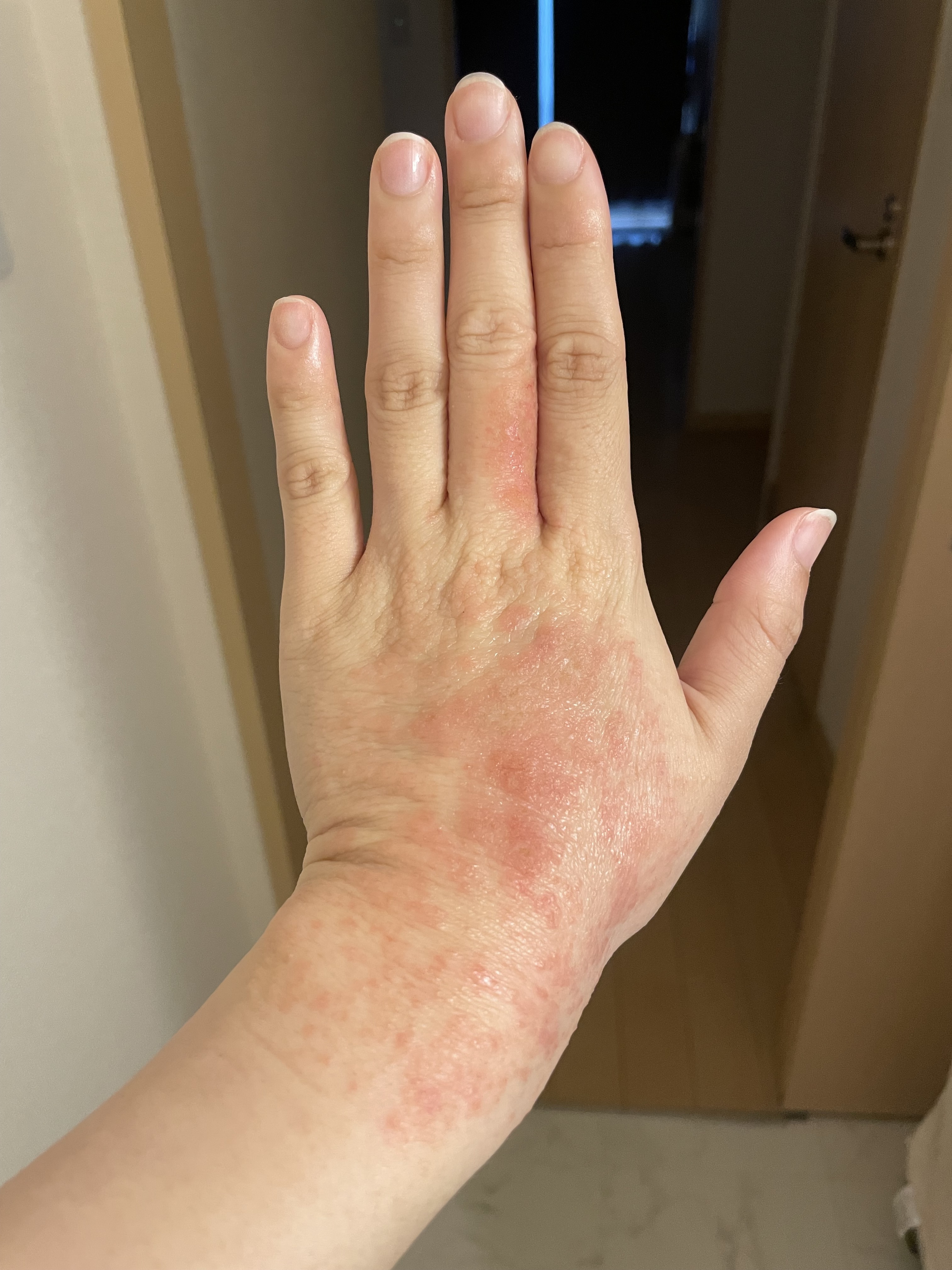 こんにちは。アトピー大爆発が良くなってから一転、また爆発しました😭人の体、なかなか一筋縄ではいかないものですね。メンタル的にも落ち込みました、、多分原因は生理前でホルモンバランスが乱れたからではないかなぁと思ってます。顔の肌も久しぶりに荒れまくってしまい、ダブルでショックです。今は体から毒素がたくさん出る時期なのかなぁ、治るから大丈夫と自分を奮い立たせてます。爆発したのがGWとかぶって楽しいはずの連休がきつかったよ〜😂アトピーには太陽光は良くないと聞いていたから気をつけていたのですが、多分たくさん浴びてしまったのでしょう。GW明けによりひどくなってしまいました、、そのGW明けの手がこちら(気持ち悪いので見たくない人はやめてくださいね)太陽光じゃないのでわかりにくいかもしれないですが、明らかに赤さ増してる、、!!また振り出しですが、めげずに頑張ります、、連休明けで気持ちが上がらない人もいるかもしれないですが、ほどほどに、自分に優しく生活していきましょう!では、また経過を上げれたらと思います!読んでくださり、ありがとうございました。