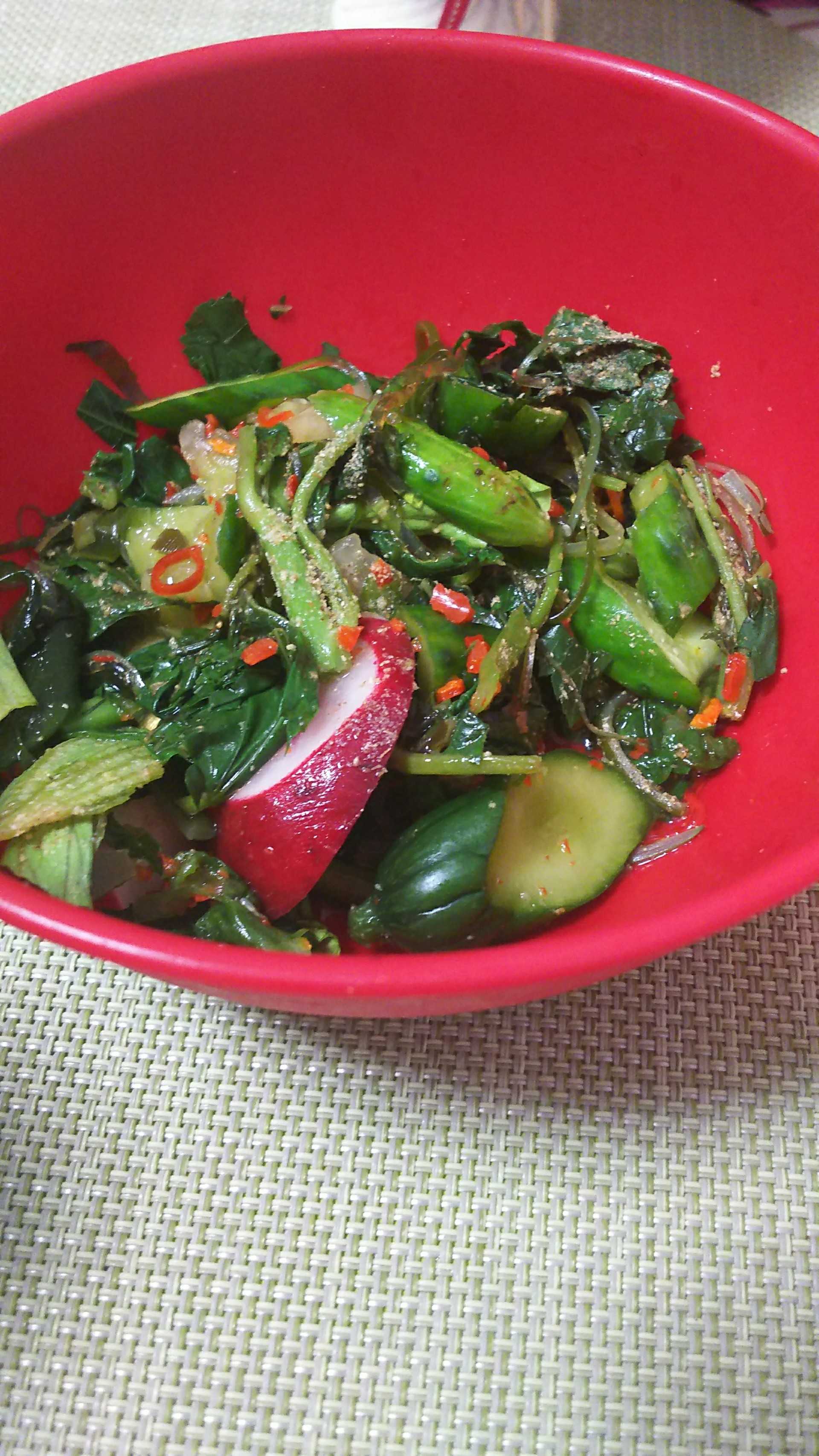 アラフィフが問題なのか?転職問題か?プクプクしてきてる旦那ちゃん事バディ対策色々考えてます♪今日はカリウムたっぷりなモロヘイヤ&きゅうり&ラディッシュのサラダ☆ラストにEXオリーブ投入♪食べる手前イン☆