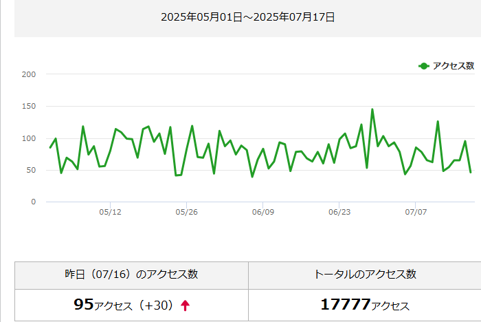 参院選にしては波乱ありそうでどきどきの連休なのですが、所詮は参院のことなので、それなりでしょうか。あるいは、あまり経験がないことなので何が起きるか分からないので静観せざるをえないのでしょうか。市場は、普通は事前にリスクオフでポジション調整しておいて、イベント通過で週明けあらためて上昇という流れが予想できます。ただ、今回のような政局含みでは、イベント通過のような過去形というわけにはいかず、ちょっとぐずぐずしそうですね。わたしは、小2の孫が夏休みになり、親が仕事の間は、相手をする約束になっていますので、相場はちょっとお休みです。姉弟を見るのは好みも違ってけんかもするし大変ですが、今回は弟くんは保育園があるそうで、ひとりみるだけなのでちょっと楽ちんです。ところで、先日7月17日にここのアクセス宇数が7並びになっていたので記念にスクショをとっておきました。ささやかではありますが、毎日60人くらいの方に見ていただいていています。昨年末から始めての累積が17777アクセスになっていました。いわゆるブロガーではなくて単なる日記なのですが、それでもアクセスがあるということは励みになります。みん株時代にはアクセスされるとあしあとが残って誰が見てくれたのか分かる仕組みになっていましたが、ここではわからないのですが、たいへんありがとうございます。縁起をかつぐほうなので、令和7年7月17日の17777達成は記念になります。何かいいことあるかも(-^^-);