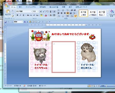 ペットショップ用年賀状、つくりました。私のは?今までの会社はお正月とても忙しかったので年賀状禁止だったんですね…んで、年賀状ソフトがパソコンについてるんですがなんかなぁ、小さい子どもの写真を送る!っぽいとかなげやりですっ!もう和風ならなんでもいいですっ!みたいなデザインであんまり好きじゃなくて。でも自分のデザインに自信がなかったので、今までどうしても年賀状が必要なときは、niftyの無料年賀状テンプレートをダウンロードしてました。デザインがおしゃれなものが圧倒的に多いんで。まぁ、私こそ、なげやり、ですねぇ。でも今年は「ペットショップの年賀」なので犬の写真も入れたいし。つくりました。ワードで。ワード便利ですよ。写真の背景の透明化は「色の変更」であっというま。画像は、レイアウトを「前面」か「背景」にすれば自由に動かせます。和風素材、今回は商用なので1500円くらいのCD買いましたが私用だったら和風素材を無料サイトで探せば、お金つかわなくていいです。印刷物の画像処理は、ワードがとっても楽なので私は宛名ラベルも名刺もワードでつくってます。