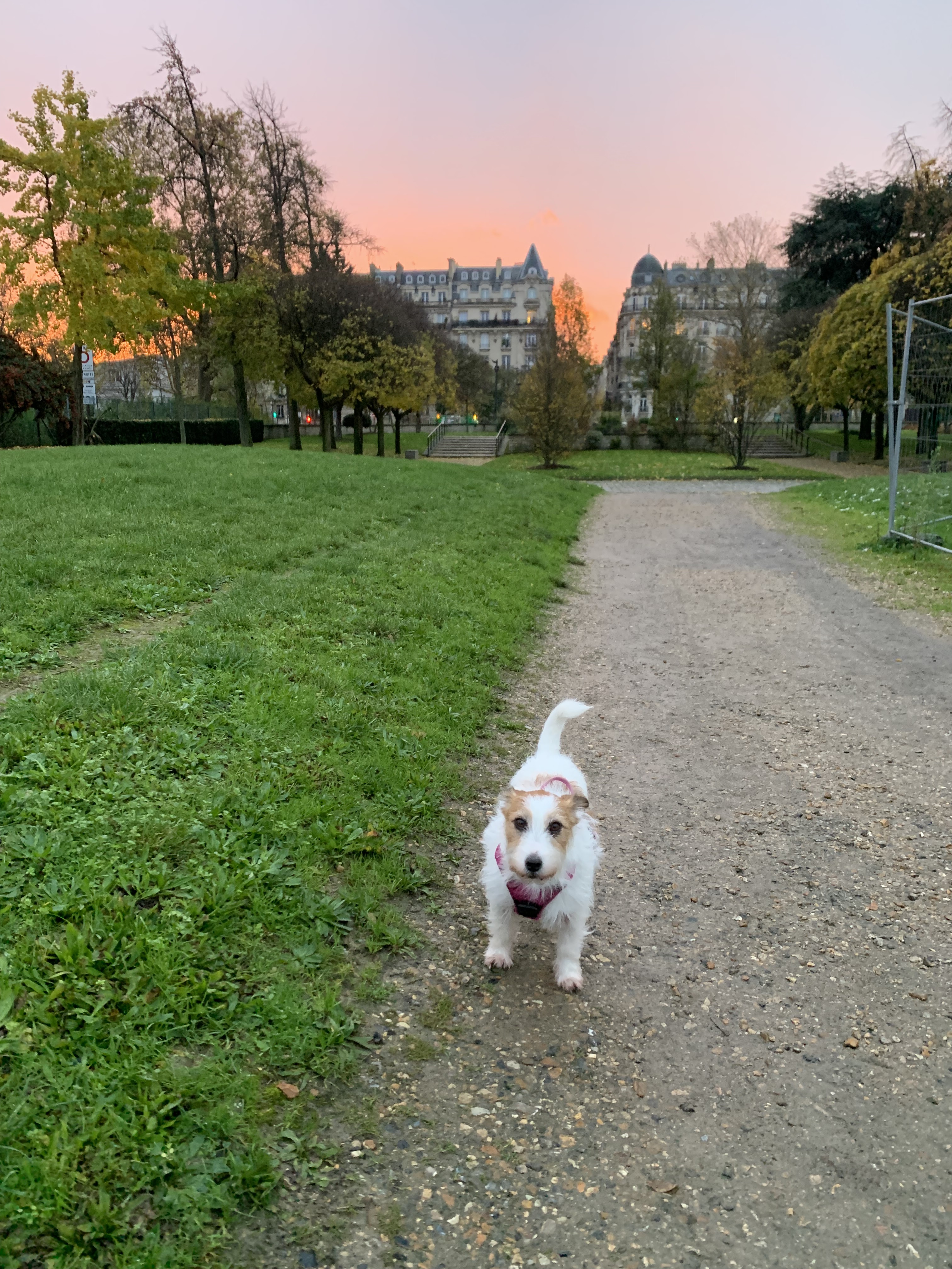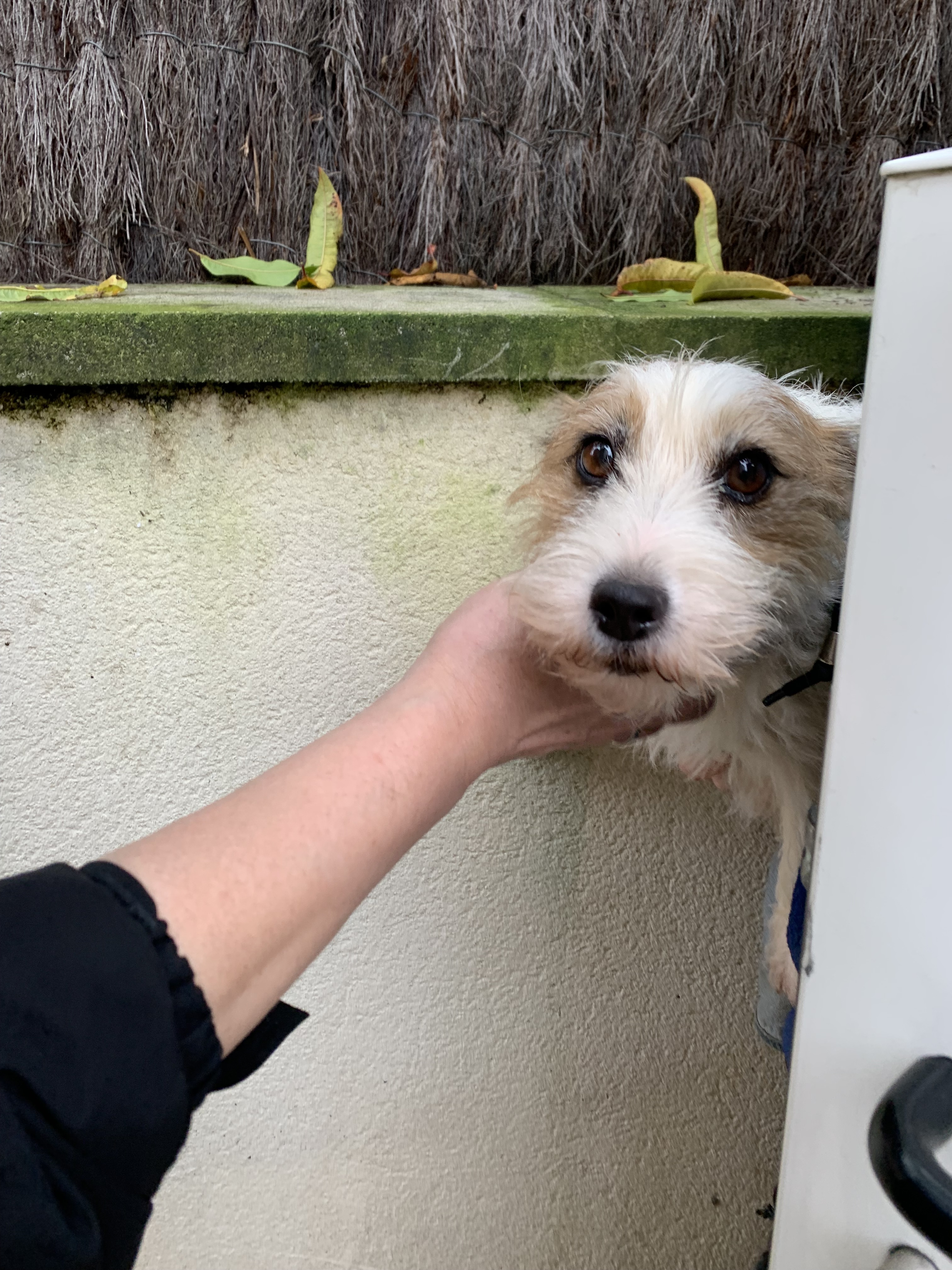 わんです。久しぶりの晴れだけど急に雨が降ったりする朝散歩ですわん。急に強い風が吹いてきたと思ったら雨が降ってきた帰り道のこと。路面電車が走る線路の上を反対側の歩道からテクテク渡ってくる小さいわんちゃん🐶がいました。リード無しのお散歩わんちゃんは珍しくもないけど、ゆっくり渡っててお利口だなー、と思って見ていました。しばらく観察していても飼い主さんらしき人は一向に現れません。線路を渡り切ったら森か環状線の道路なので住宅街側から人が来たら聞いてみようと注視していました。わんちゃんは環状線の方へ行ったら危ないのでひとまず追いかけて安全確保のためあんさんのリードをかけました。その後その場で30分くらい待ってみましたが飼い主さんらしき人は来ず、雨が本降りになってきたので迷子わんも連れて一旦帰宅する事にしました。その道すがら近所の犬友さんに会ったらこの子のこと知っているか聞いてみようと思いましたが悪天候のため顔見知りさんにはだーれにも会えませんでした。帰宅して家に入ったら外では気にならなかった迷子わんの臭いがエグかったので申し訳ないけど玄関先でお待ち頂きました。よーく見たら首輪にところどころ消え掛かっていましたが連絡先電話番号を見つけました!この日の午前中は娘が家に居たので急いで電話番号にメッセージで連絡してもらいました。すると直ぐに最寄り駅まで引き取りに来てくれると返信が来ました。良かった〜😭この子、あんさんのことが凄く気に入ってしまったようであんさんのお尻から全然離れない💦とにかく急いで駅に向かいました。その間、飼い主さんから2、3度電話がありましたが私がしどろもどろなフランス語なので相手がかなり怪しんでいるのが伝わってきました💧会ってから、自分は日本人でフランス語が話せなくて・・・と説明して納得してもらえました。高速地下鉄で言うと2駅先くらい先の場所から姿が見えなくなったらしいです。大型犬も一緒なのでそちらに気を取られて見失ったと言っていました。そうか、この臭いは大型犬かー、と合点がいきました。でも無事に引き渡せて良かった!このまま飼い主不明だったらどうしようかと思いました。あんさんも一人になれてホッとしていました。どうやら迷子わんの場合、怪我をしていたら消防で(わんもねこもレスキュー対応してくれる)怪我無しで首輪などしていない場合は動物病院へ連れていって良いそうです。これで迷子わん🐶を見つけたのは2回目です。2度ある事は3度ある・・・?にならないと良いけど💧