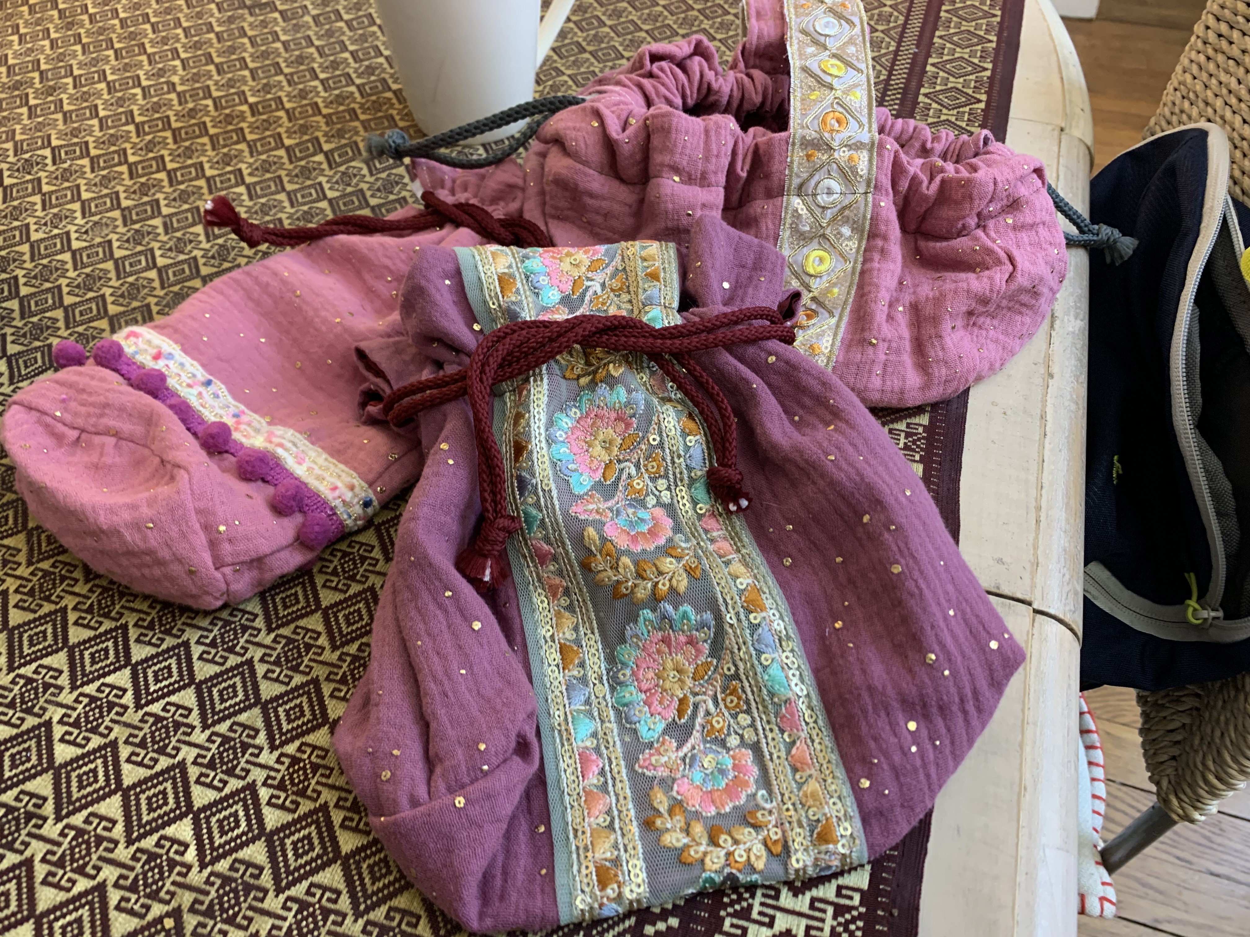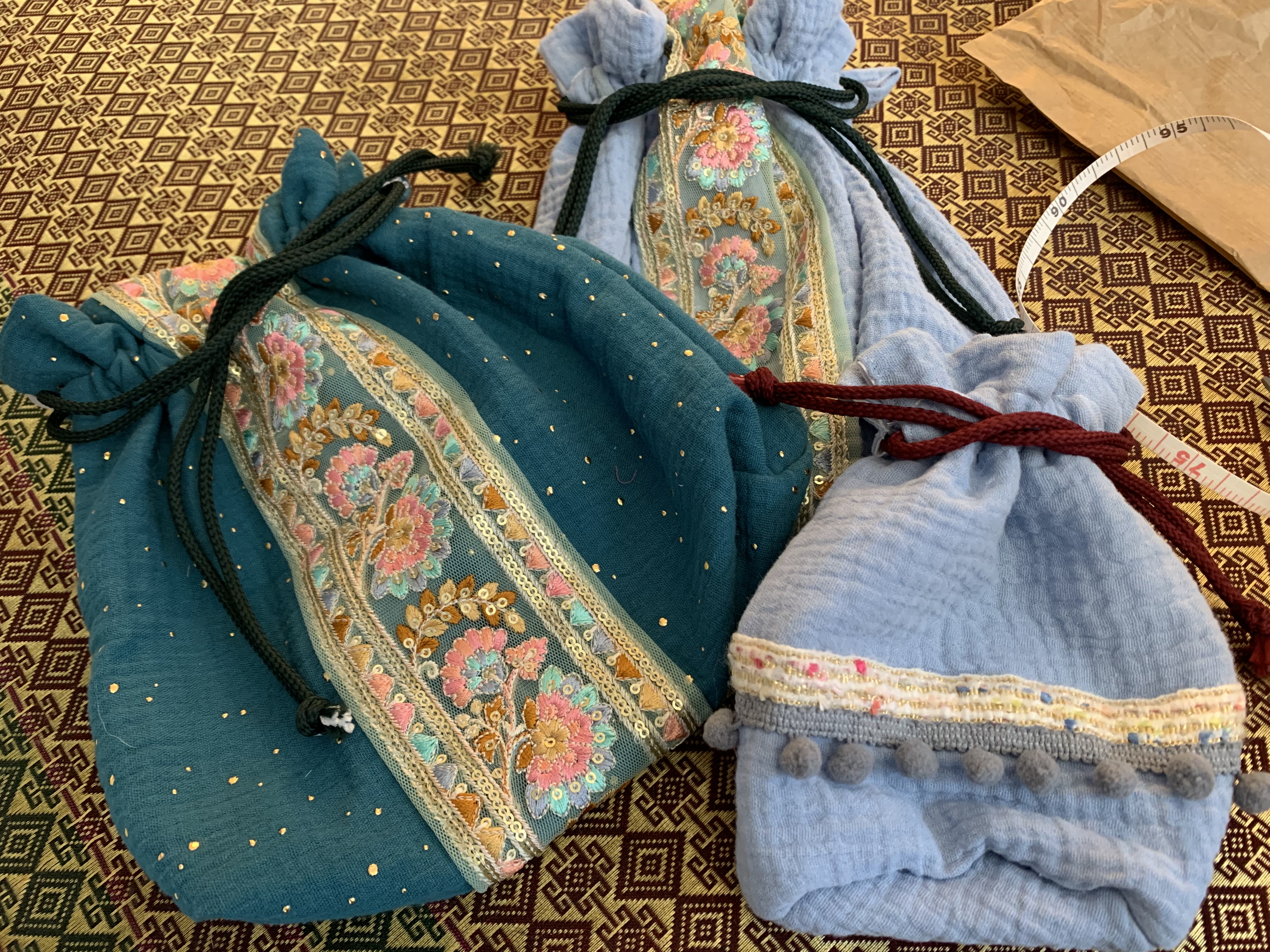 ダブルガーゼと刺繍リボンで巾着を作ってみました。