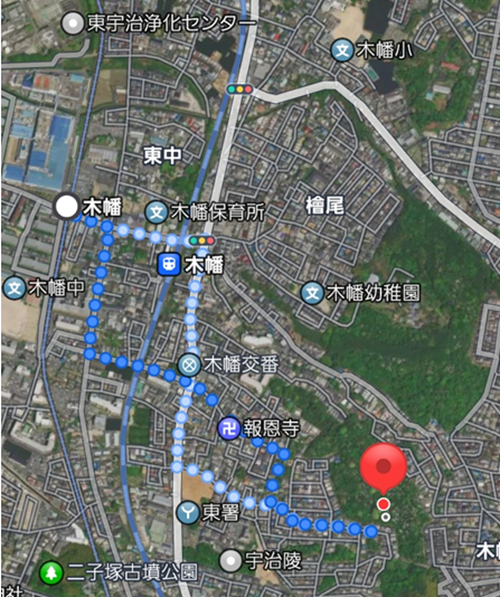 9/12のブログで一条天皇の彰子皇后の木幡の宇治陵へ行ったことを書きました。その時はヤフーマップで教えられてこの地図の赤丸向かったのですが・・・それらしき御陵が何処か分からなくて、目的を達せずに帰ったことまで書きました。・・・で、帰ってグーグルマップで調べ直すと、こんな地図が出て来て・・・・散在するお墓の総拝所がある事が分かったことまで書きました。さて乗りかかった舟、中途半端で終われないので、今日再度行って来ました。場所は・・・上の地図に新たに赤矢印を記した場所でした。京阪電車木幡駅から10分弱と近く、赤丸印のある高い所まで行くことは必要なかったのです。まあ、簡単に初めからここへ行っていたのでは、広く散在して自然の中に溶け込んでいる宇治陵の全貌を知ることも無かったことを考えると間違ってアチコチ探し回ったことも無駄ではなかっと自分で納得はしたのですが・・・。さて、駅から向かい、旧街道を外れますとこの景色です。さすが宇治です。着いて分かったのですが、左前方の木立が目的の総拝所でした。この軽トラックが止まっているところが入口でした。左の建物は後述更に進みますと・・・と言う程の広さは「全く」無いのですが・・・敷地は狭くても荘厳な雰囲気では有ったのですが・・・・道を隔ててマンションがあり、反対側も住宅が隣接していました。小さな建物は・・・宮内庁の建物でした。お参りしての帰りはこんな風景・・・直ぐ傍をJR奈良線が走っていました。この軽トラは・・・広い宇治陵を管理する為の宮内庁の車のようでしたが定かではありません。勿論建物は無人でした。(軽トラのバックライトが点いている様に見えますが、これは私のカメラのフラッシュの反射てす)・・・・と言う事で今回は目的を達して、この件でラインでやり取りしたこの近くに住む姪に教えて貰ったこの店に寄り、パンを仕入れて帰りました。