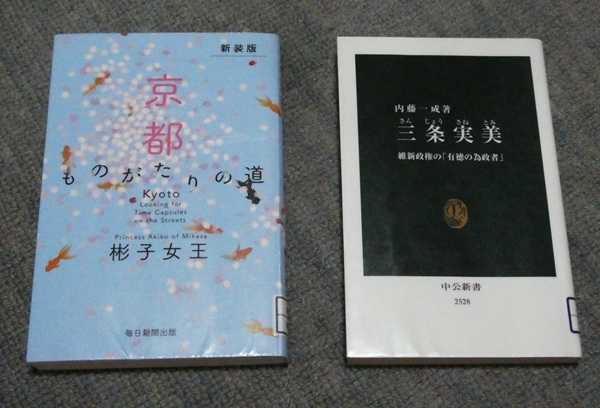 先日妙法院の仏教文化講座の「七卿落ち」を聴講して三条実美に興味を持ちました。実美は梨木神社の祭神でもあるらしいのですが殆ど何も知らなかったのです。そこで、ここは三条実美を勉強しようと思って、図書館で右の本を借りて来て読み出したのですが・・・7月に申し込んだ左の本が順番が来て借りることが出来たのです。三笠宮の彬子女王のこの本、凄い人気なのです。当市には図書館は9ヶ所あって各図書館の蔵書としてある為、全9冊の蔵書が有るのですが・・・・7月に貸し出し申し込んた処31人待ちだったのでした。それで人気の程が知れる本なのですが・・・やっと順番が回って来て、今日準備が来たとメールがあったので早速借りに行ったのでした。そんな人気の本なので待っている人がいるので、貸し出し期間の延長は出来ない事もさることながら、私自身も待ちに待った本ですので・・・「三条実美」は後回しにしてこの本を先に読むことにしました。帯にはこの様に書かれている本です。待ちに待った本、明日から読むのですが、楽しみです。もし関心持って頂いたら・・・目次はこの様になっています。