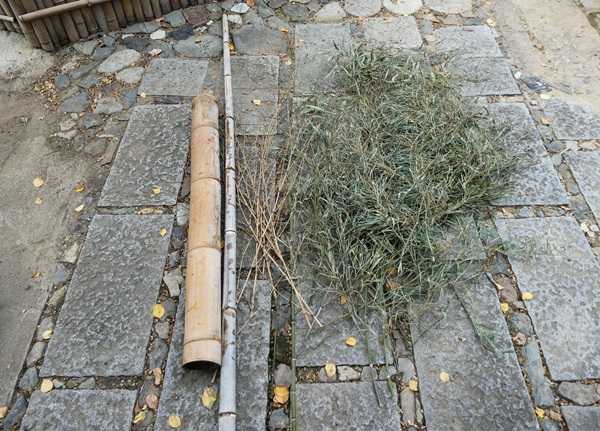8/27のブログで元々ここまで敷いていたレンガタイルを・・・新たにこれだけ買って・・・・追加工事をして・・・ここまで完成したことを書きましたが・・・写真の奥の方がどうしても気になるので・・・・9/20に更に新たにこれだけ買って・・・・奥の方の拡張工事を始めたのですが・・・やり出すと、もう少し広げようと欲が出て・・・・また9/23に更にこれだけ追加購入して・・・ここまで広げて完成としました。角が欠けている部分と真ん中に抜けている個所があるのは・・・・元は池だったので石の縁石が埋まっているのでタイルを敷けないのです...・・・と言う事で、余裕をもって椅子を置けるようになりました。これで敷石もレンガタイル敷きも・・・・灯篭の明かりも完成したので・・・・次のヒマ潰しの為にこんなモノを貰って来ました。古い太い竹と、細い竹、そして枝です。これで又遊べそうです。