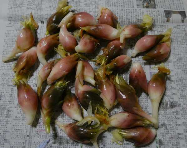 義兄、義姉から又々 手作り野菜を沢山貰いました。タマネギ、ジャガイモ、ナスビ、米などたっぷりと・・・これはいつもの通りなのですが・・・・今回は初めて太くて大きく、実に色の良いミヨウガをこんなに沢山もらいました。因みに我が家のミョウガは今年特に不作で、余り採れずでした。毎年の事なのですが、採れるミョウガは細くて小さくて、良い色のものは余り採れないのです。しかるに貰ったミヨウガが大きくて、まるまる太って、実に色の良いものばかりで、売っているミョウガでもこんなのない程の「秀」ランク? ばかりでした。どうしたらこんな立派なミョウガが出来るのか、今度とくと訊いてみないと・・・・・・・・・で、当然のことですがミヨウガ尽くしが始まりました。余りに沢山有るので・・・・初めてお好み焼きに・・・美味しかったのですが、ミヨウガ独特の存在感が弱くなった気がしました。それから、天ぷら と 貰ったナスのからし和えにも・・・いつも思う事ですが、ミョウガは天ぷらが一番最高、独特の味と香りが一番楽しめます。勿論、ナスともバッチリ!!!! 暫くはミョウガが楽しめそうです。子供の頃、ミョウガを食べると物忘れが酷くなると言われたものですが・・・