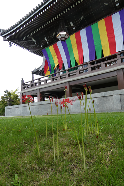 昨日は妙法院の事を書きましたが、その妙法院に行く時智積院を通りますと・・・・彼岸花が咲いているのに気付きました。株は沢山有るのに、まだたった2輪だけの開花でした。いよいよ秋の気配・・・と写真を撮っていると私につられたように俄か「カメラマン」も・・・で、良い撮影会になりました。ところで「まだ2輪・・・これからだ!!! 」と思っていたのですが、他の方のブログで沢山咲いた彼岸花の写真をのせておられたのです。智積院の彼岸花は「おくて」かも知れません。妙法院と智積院と来れば・・・・三十三間堂ですが・・・NHK20日のブラタモリで三十三間堂が取り上げられていました。観られた方も多いようですが、私はビデオで録って今日観ました。その中でへ~と思ったことは長い建物の沈下を防ぐために地盤改良がおこなわれていたということでした。粘土層と砂礫層を交互に何層も・・・平安時代にそんなことが・・・びっくりでした。それから見た事のない光景が紹されていました。それはこんな光景でした。こんな幻想の世界、凄いと思いました。それから近くの秀吉が作った大仏の跡地も紹介されていたのですが、いつも何も思わなくて通っていてのですが、こんなモノだったとか。しそしてこんなに大きなものだったとか。知っているようで知らなかったこと。色々教えて貰って大変参考になりました。見られなかった方は再放送が有れば・・・・是非お薦めです。