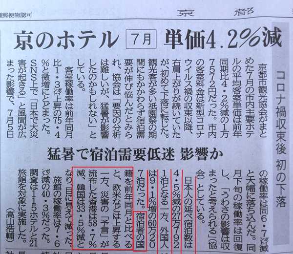 今日の京都新聞の記事ですが・・・宿泊者数は 日本人より外国人の方が多い のは相変わらずですが倍以上とは異常では???外国人で混雑する、宿泊料が高い、予約がとり難い・・・京都・・・・日本人観光客が減るのは由々しき問題です。